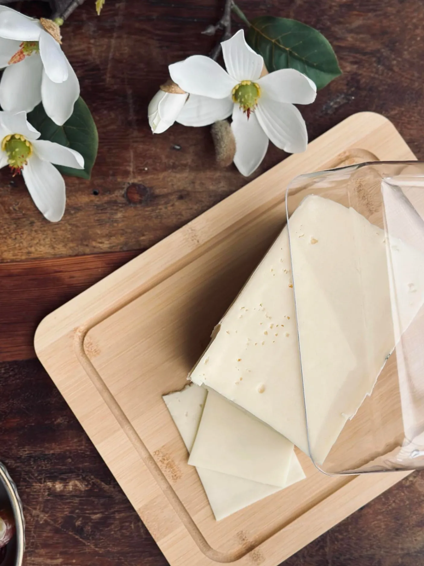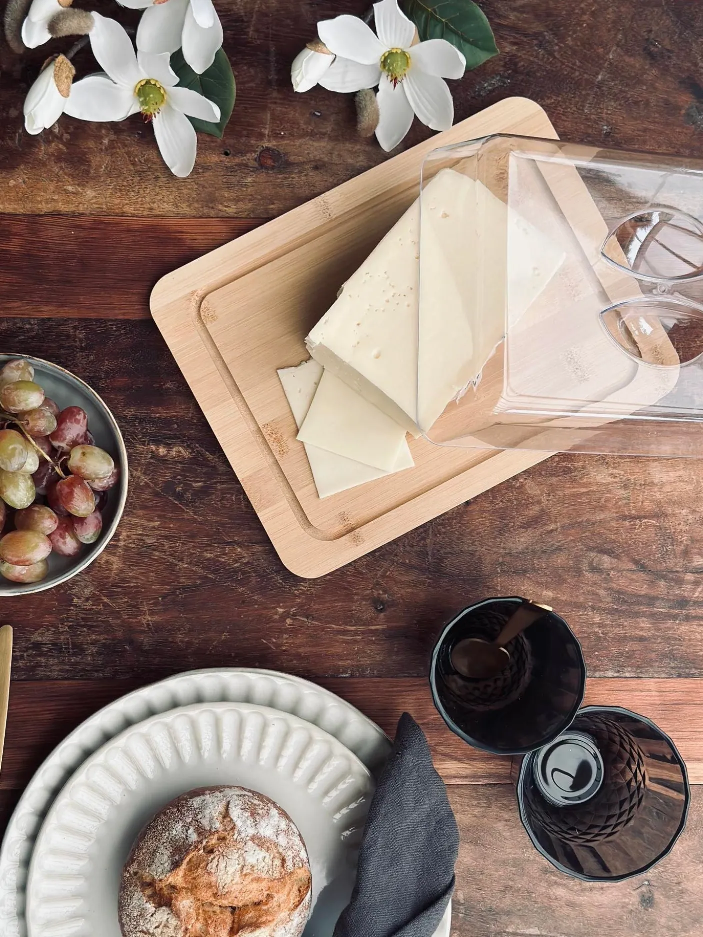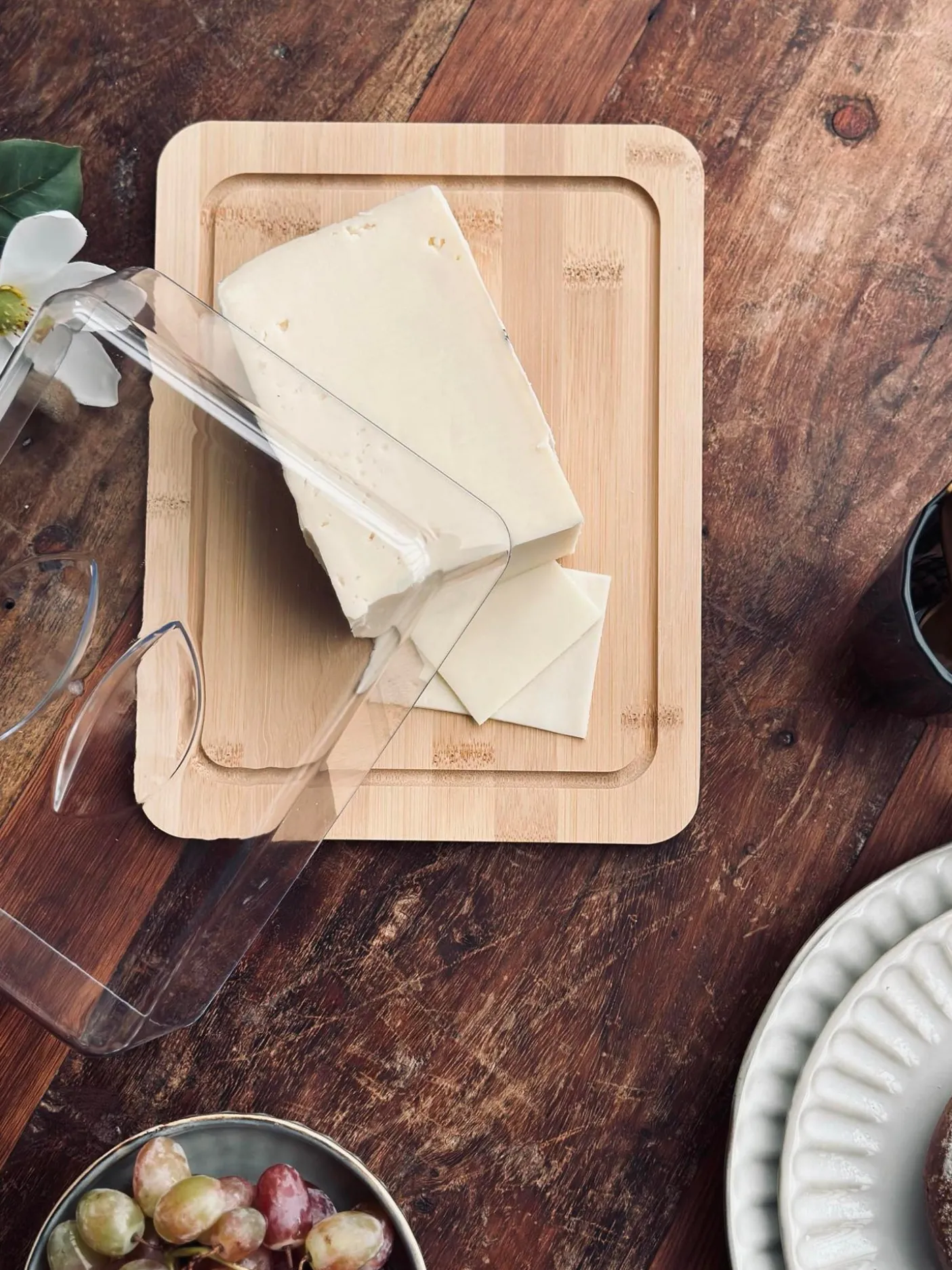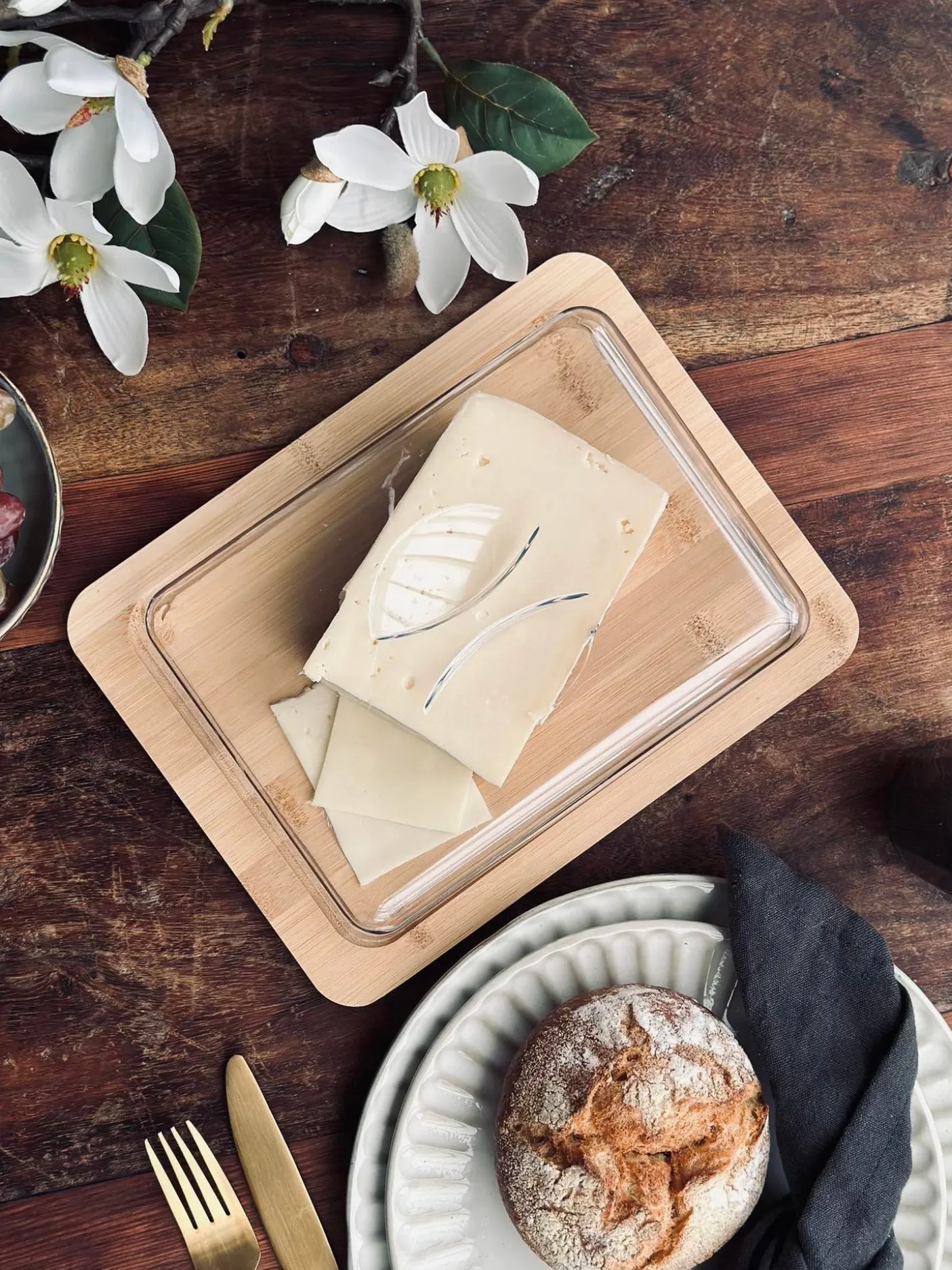 Dette ostefad med låg gør det nemt at servere ost med et roligt, naturligt udtryk. Fadet har en underdel i træ og et låg i plast, der samler serveringen og giver et enkelt look på bordet.
