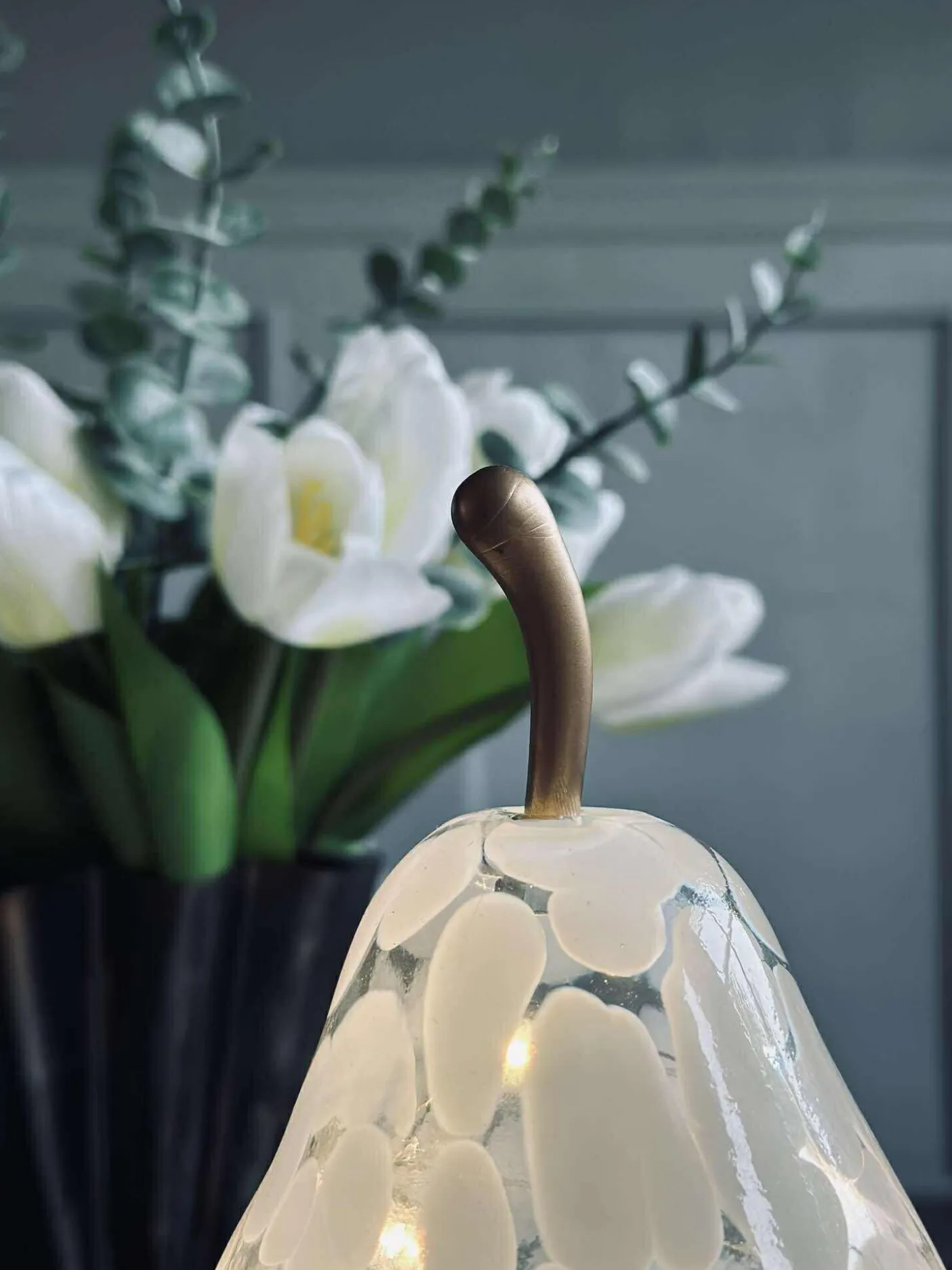 Lampen er lavet af glas og lyser via led lys.