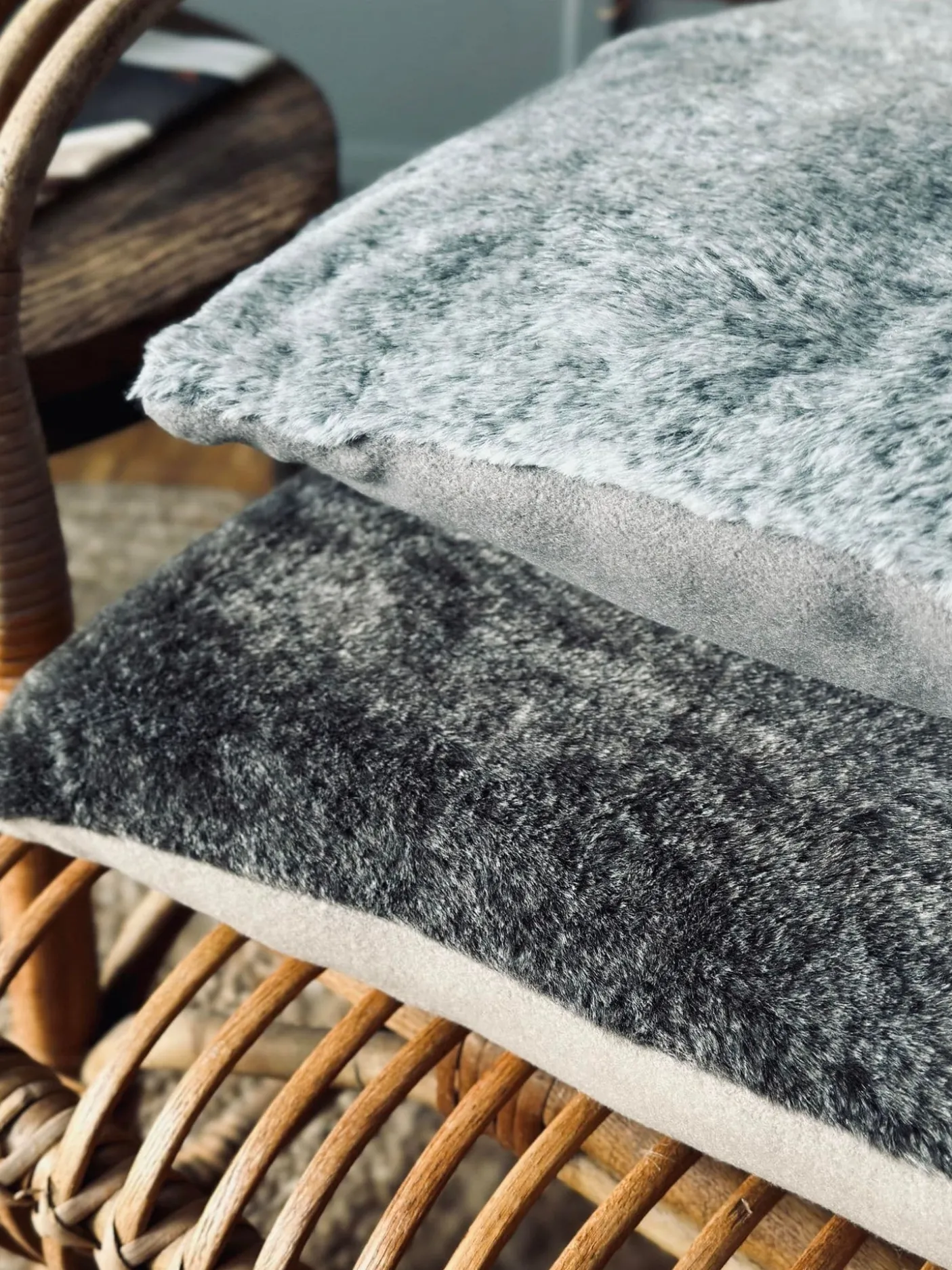 Vamset pude i grå plys med brun bagside.