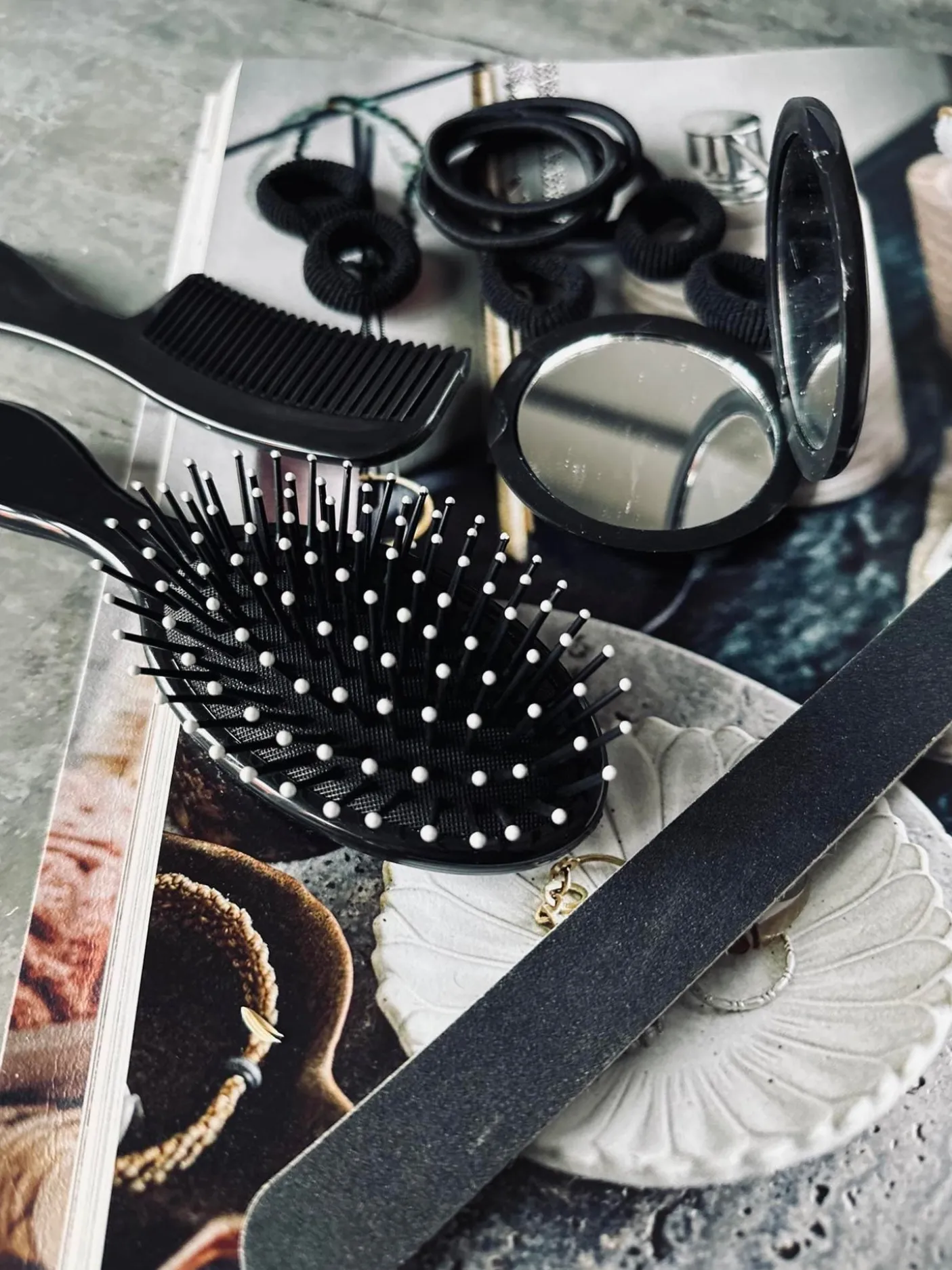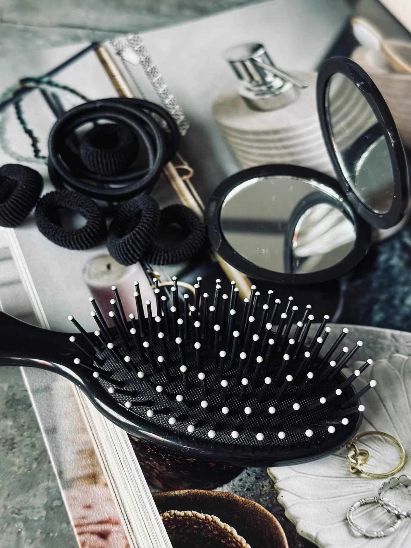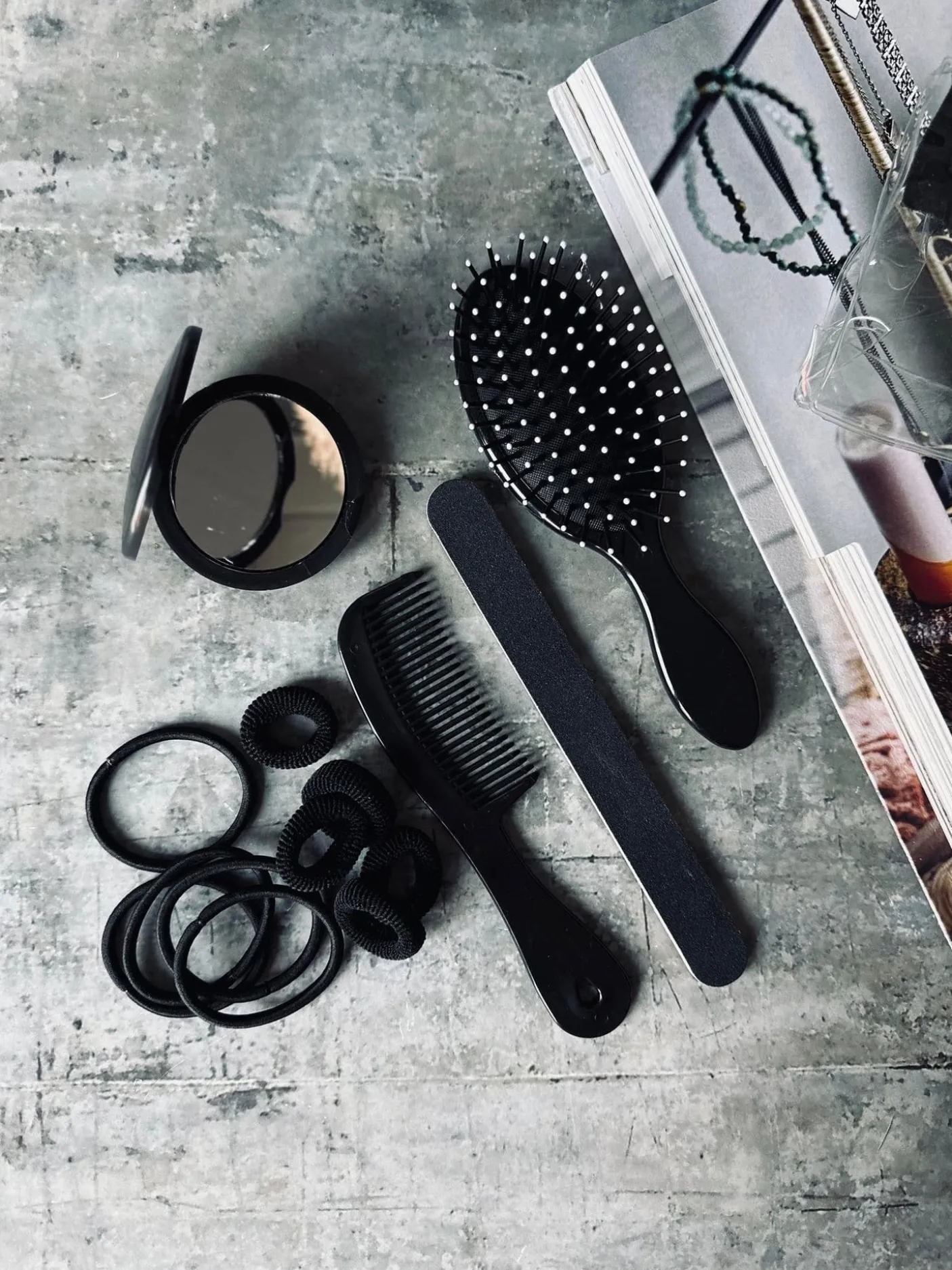 - 14 dele – Hårelastikker , børst, kam, spejl mm