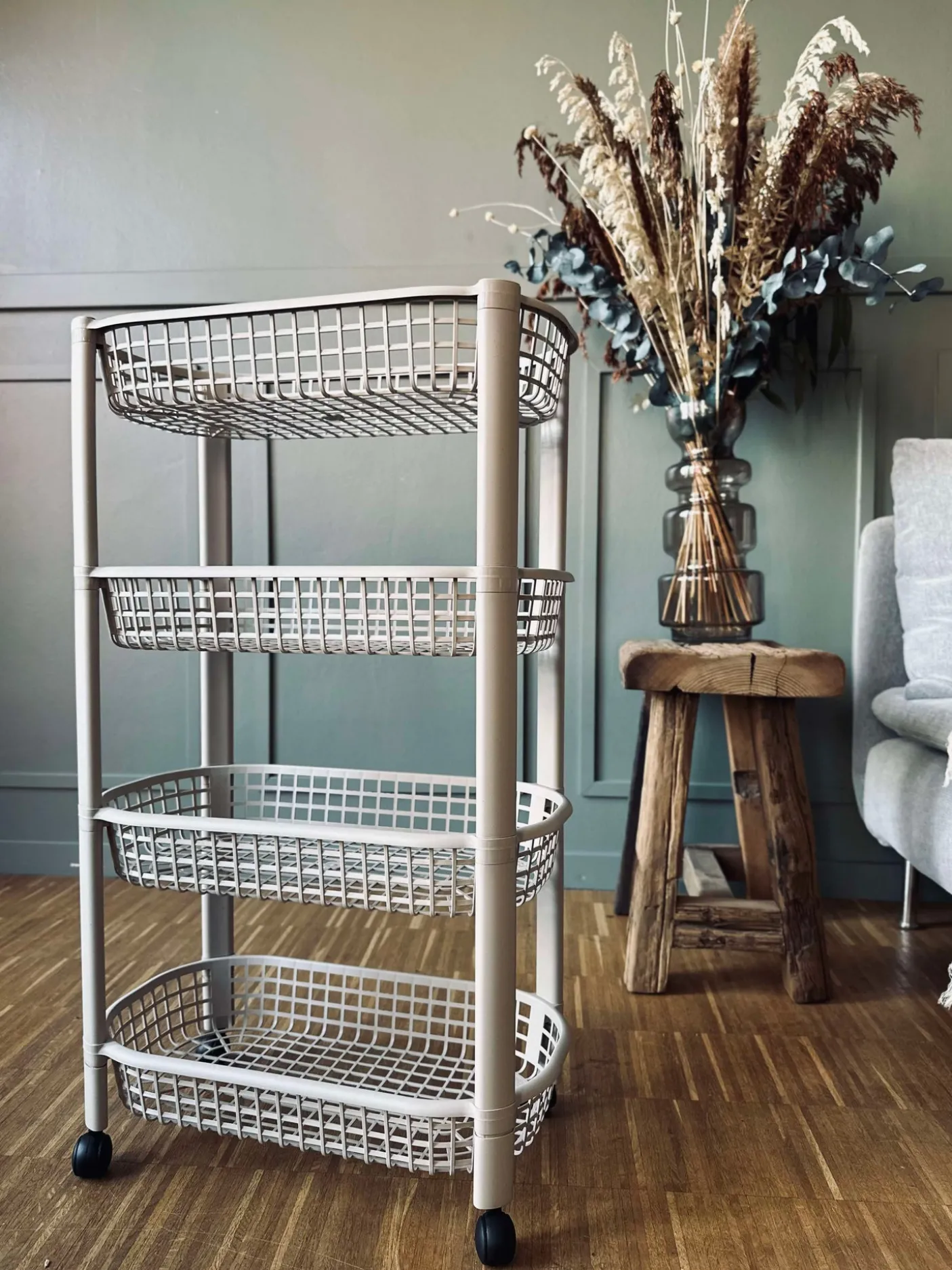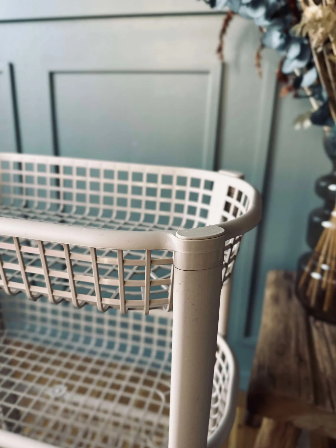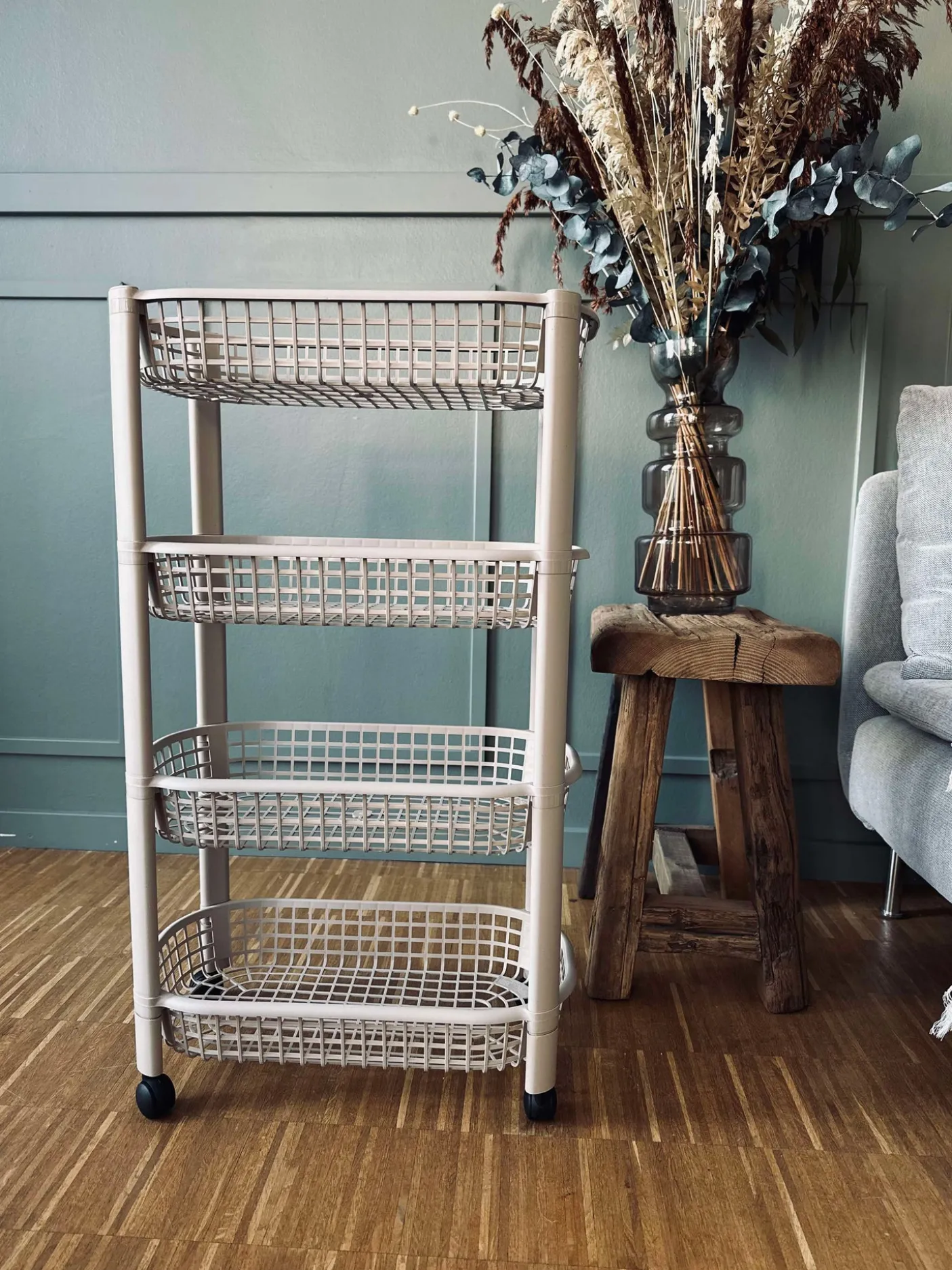 - Beige plast med sorte hjul