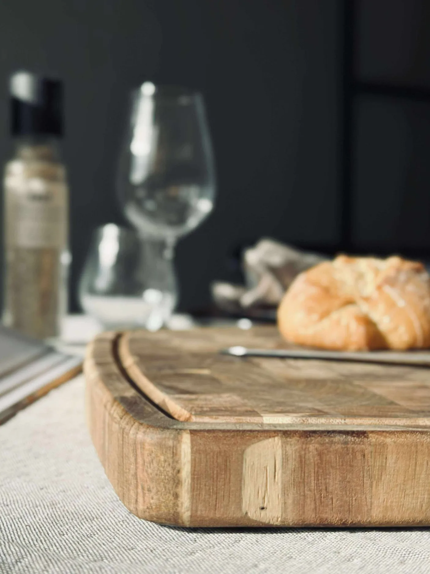 Skærebræt med saftrille i massivt akacie – et stort og solidt bræt til køkkenet. Den dybe saftrille hjælper med at samle væske, når du arbejder med råvarer. Det ensfarvede, brune udtryk giver et roligt og naturligt look på bordet.