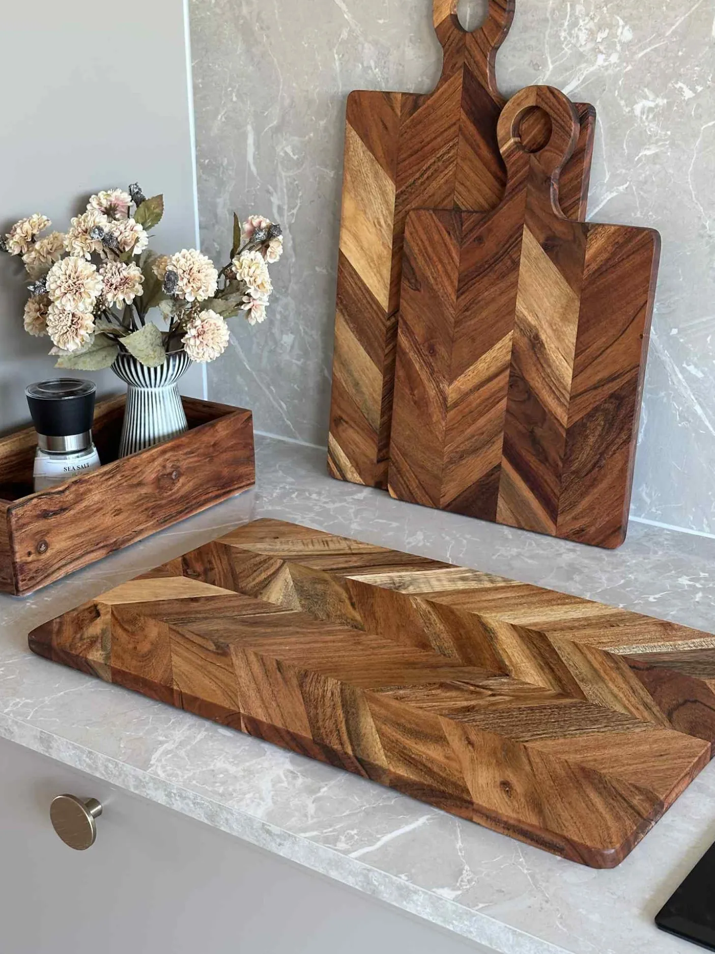 Skærebrættet er lavet af akacietræ, hvilket giver en naturlig holdbarhed og modstandsdygtighed over for fugt. Dette gør det ideelt til daglig brug i køkkenet, hvor det kan modstå skader fra knive og samtidig bevare sit udseende over tid. Akacietræets naturlige mønstre tilfører desuden en æstetisk værdi, der kan komplementere enhver køkkenindretning.