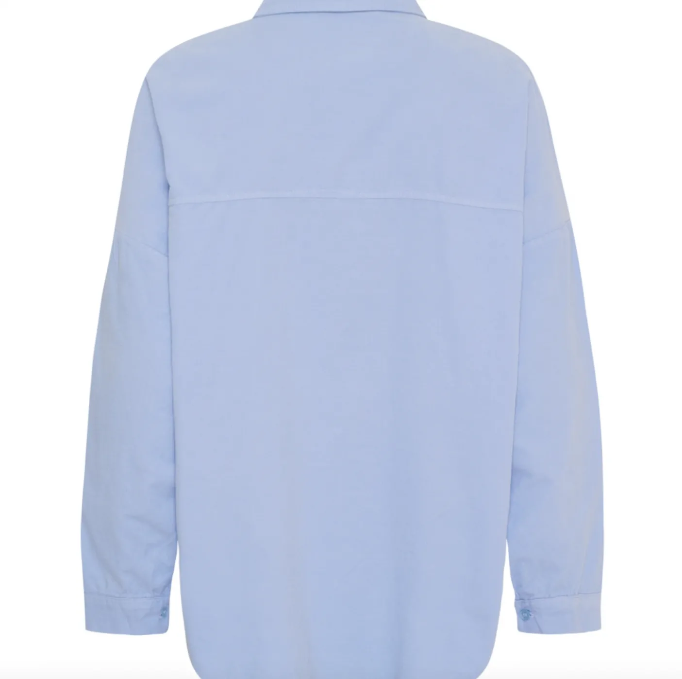 Skjortens rene linjer og bløde fløjl gør den velegnet som overdel til både afslappede og mere polerede outfits. Farven blå bidrager til et roligt udtryk, som nemt kan kombineres med neutrale toner.