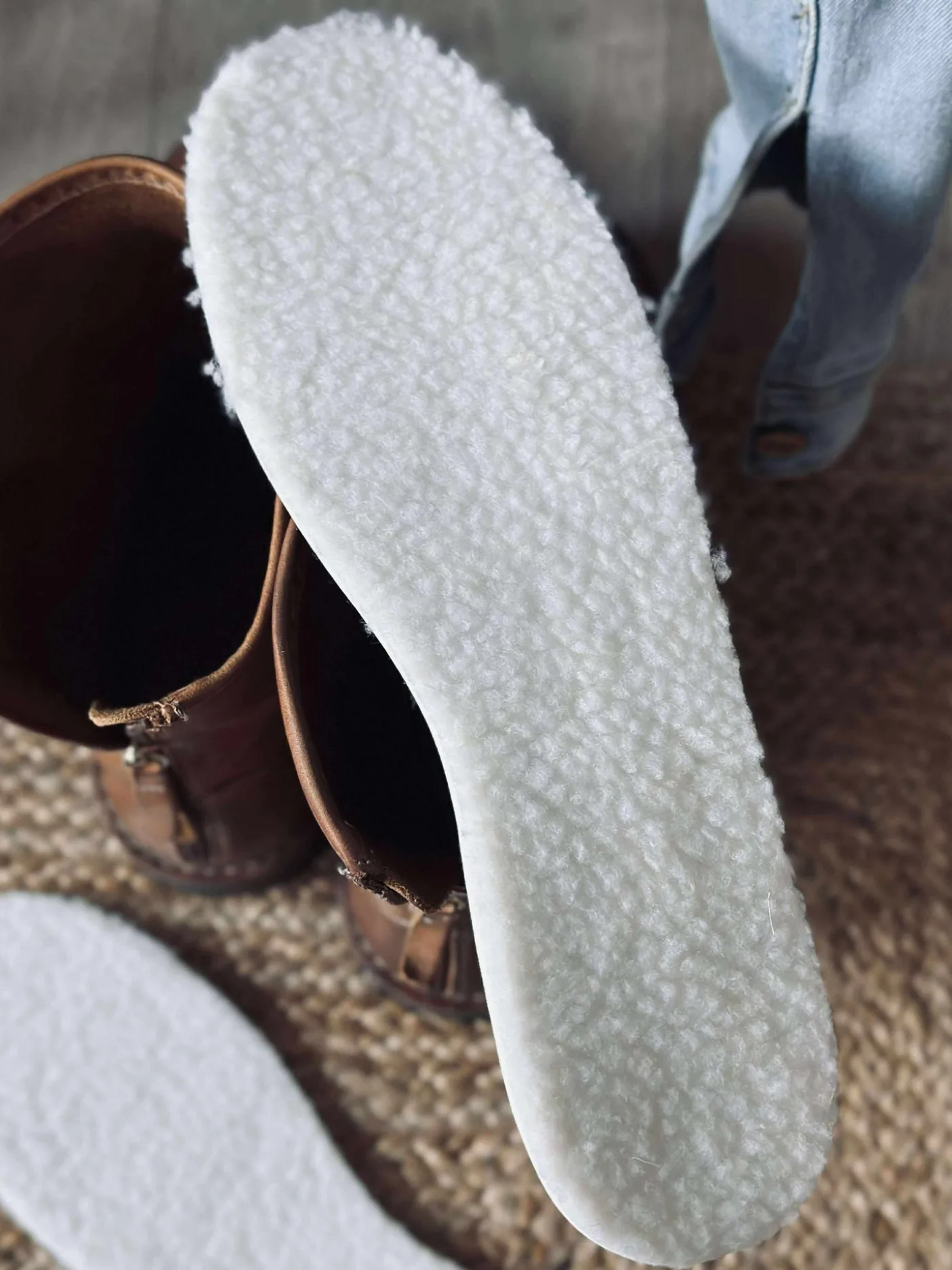 Disse skoindlæg er lavet til at lægge i lukket fodtøj, når du ønsker ekstra varme og komfort. De er udført i hvid, ensfarvet uld og har en enkel form, som gør dem lette at placere i de fleste sko.