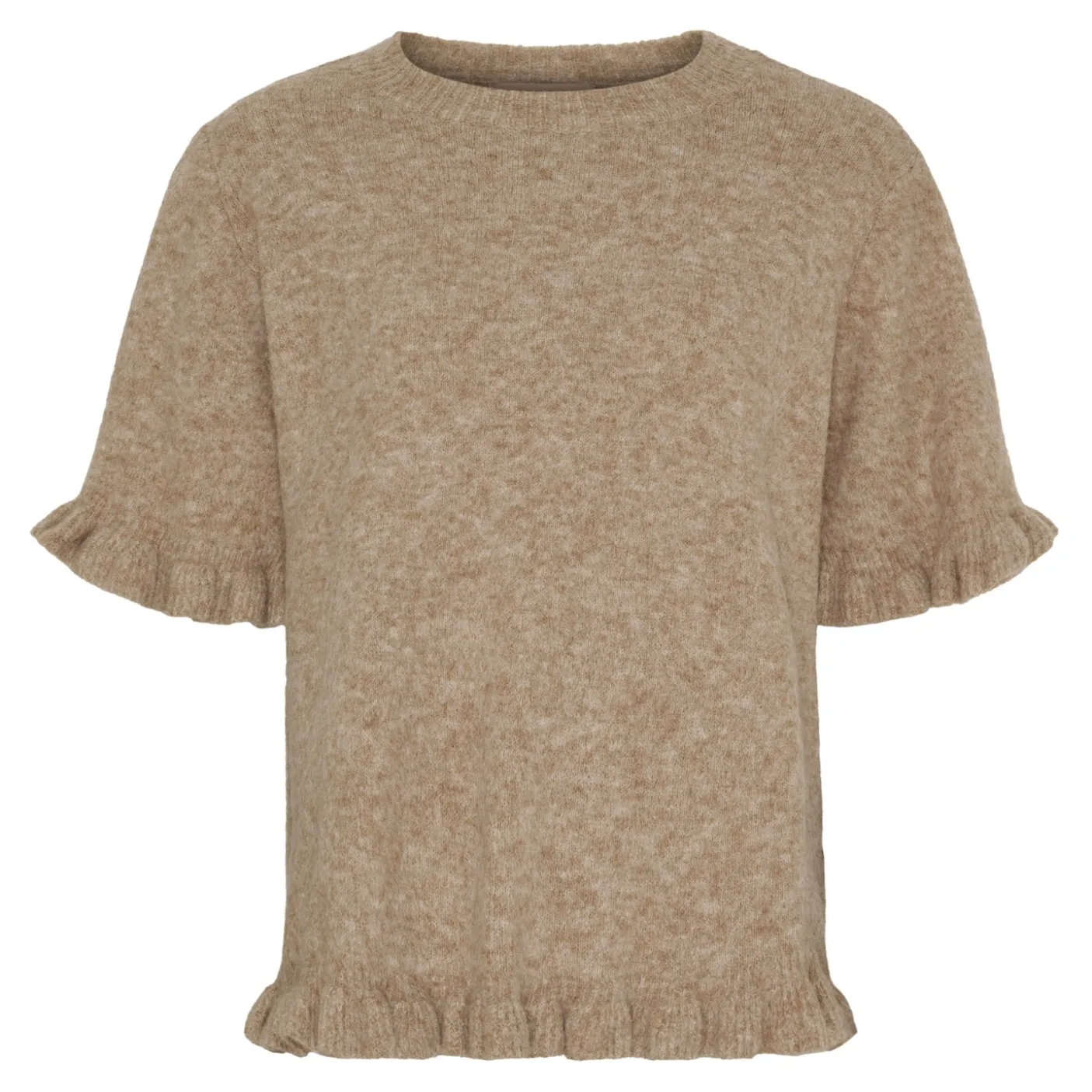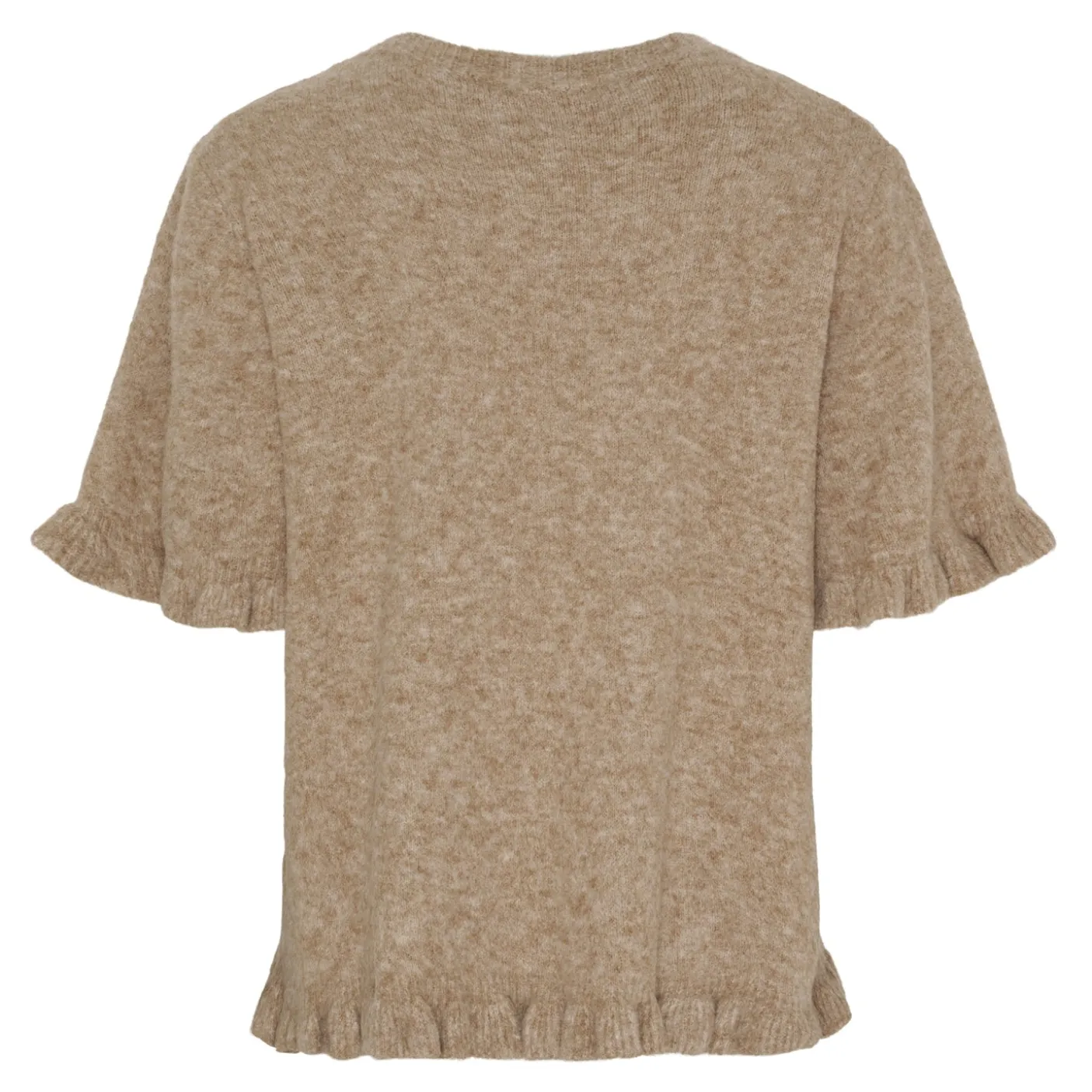 Flæsekanten bidrager til et blidt, feminint udtryk der gør strikken velegnet som synlig overdel i flere sammenhænge uden at være prangende.