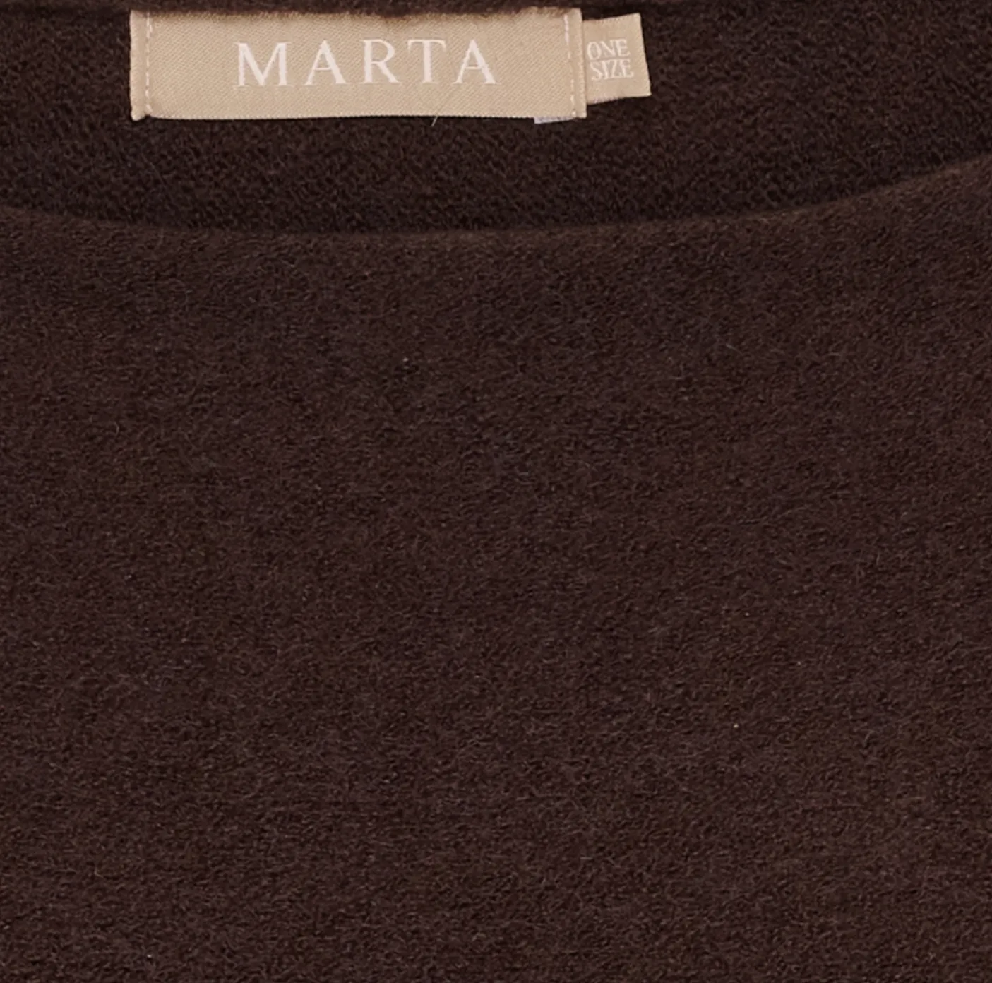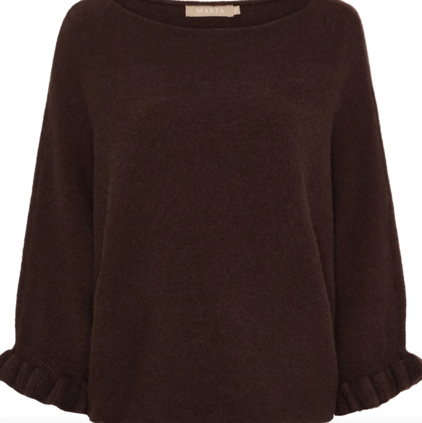 Elegant og tidløs strik fra Marta du Château. Strikken er one-size med en let pasform. Den har en rund halsudskæring og fine 3/4 ærmer med flæse kant.