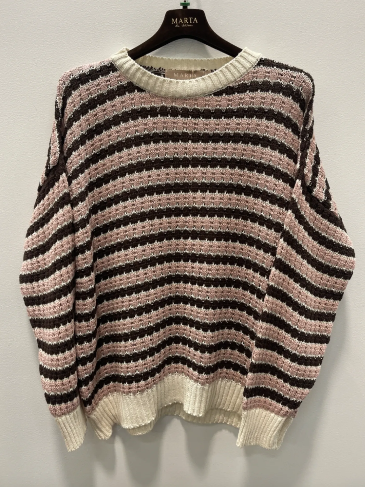 Skøn strik med striber i farverne old rose og brown. En let overdel fremstillet i en blanding af bomuld og akryl, tilgængelig i størrelserne S/M og L/XL. Materialesammensætningen er oplyst som 50% bomuld og 50% akryl. Udtrykket er roligt og klassisk takket være det stribede mønster.
