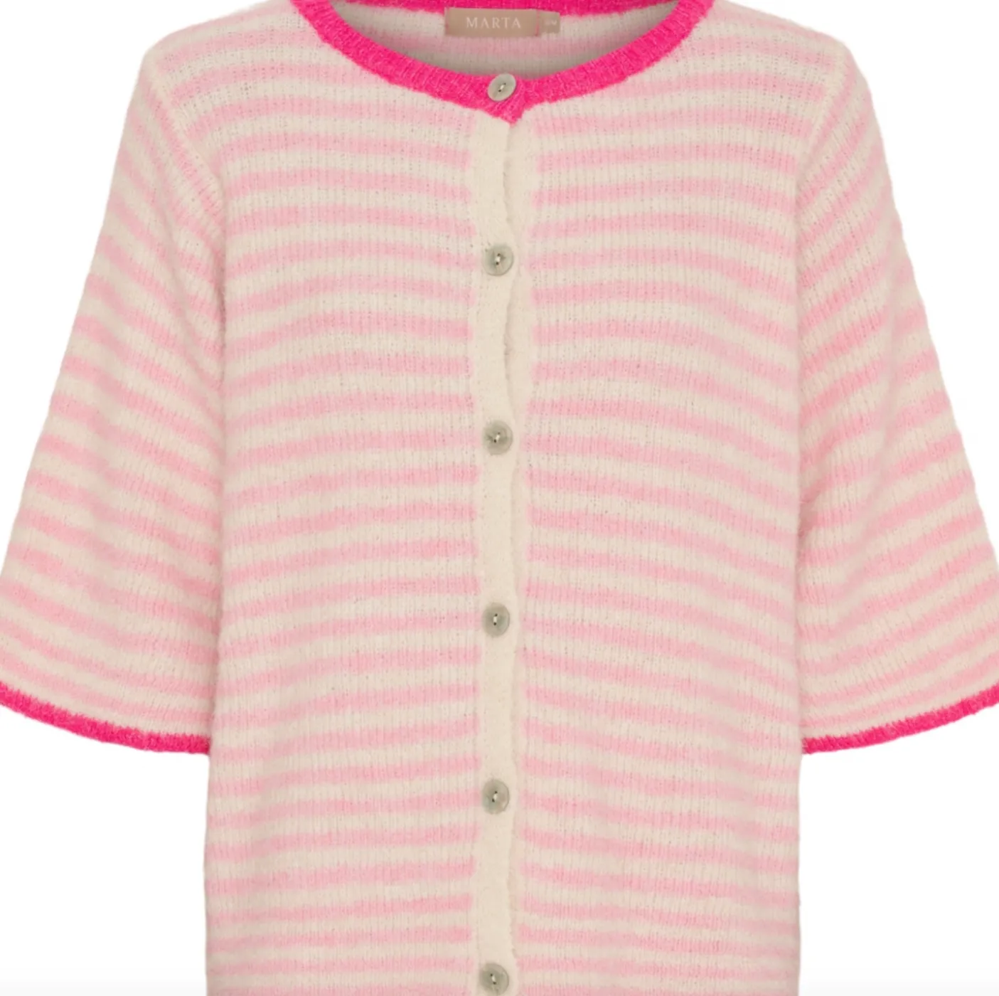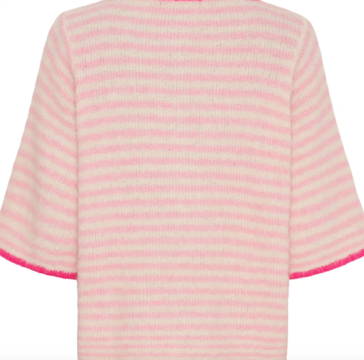 Brug strikken som et lag i køligere vejr eller alene som en enkel overdel til jeans eller nederdel. De fine striber og den pink farve giver et afdæmpet grafisk udtryk, der kan fungere i både afslappede og mere sammensatte outfits.