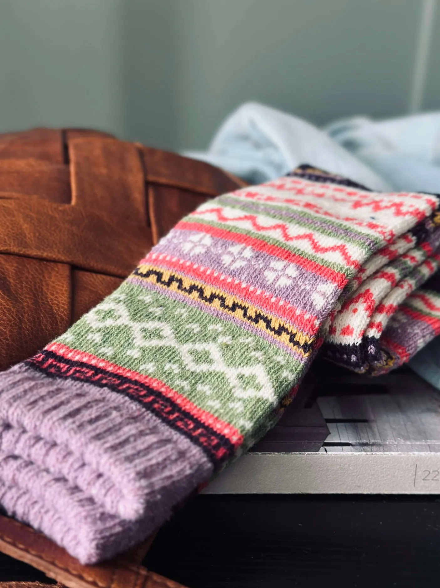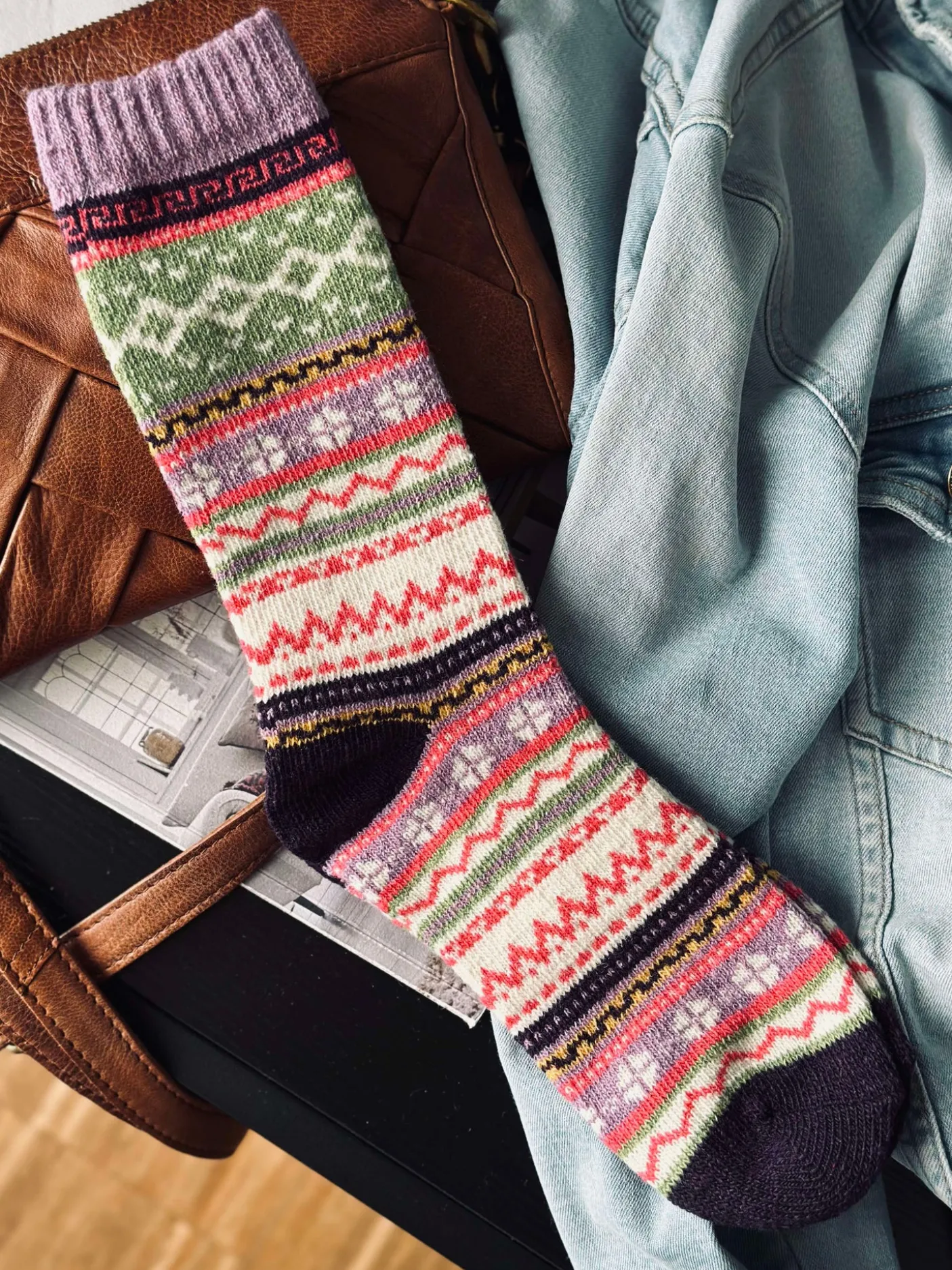 Strømper – Lilla mix er et par lækre, bløde lilla strømper i onesize med et let meleret udtryk. Det grafiske/geometriske mønster giver et moderne look, der er nemt at style til både lyse og mørke outfits.