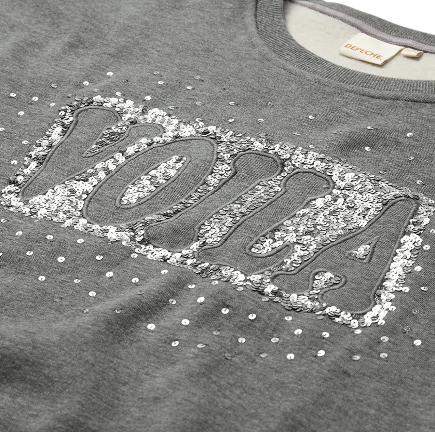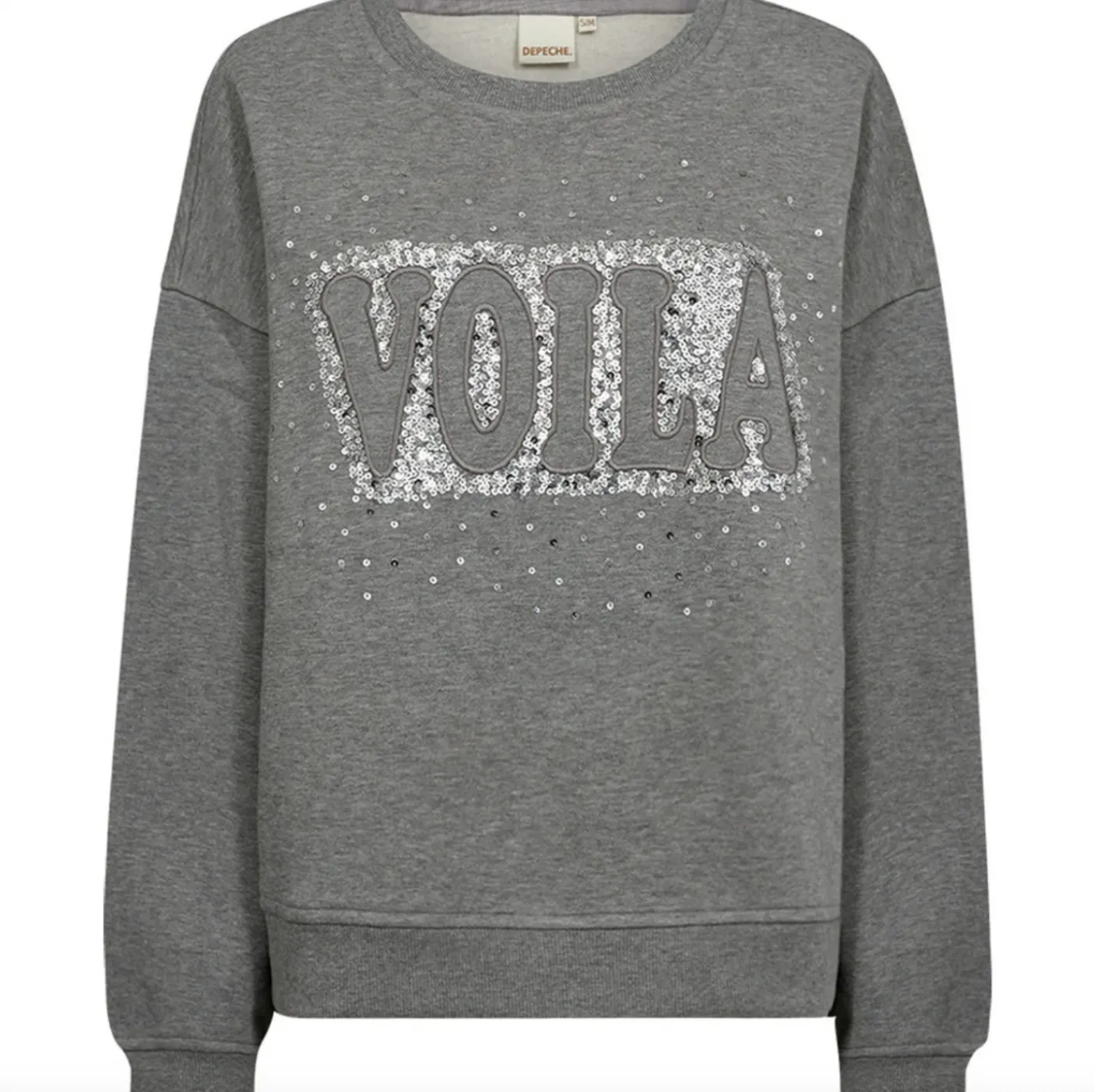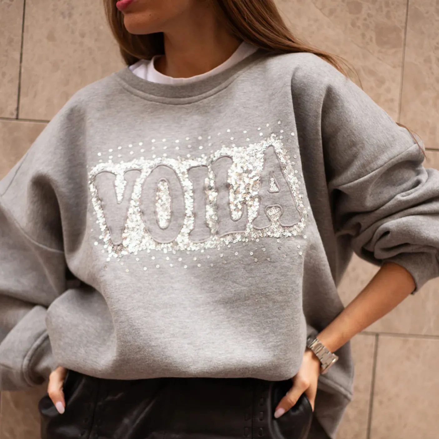 Vores smukke Lilu sweatshirt er en perfekt kombination af komfort og stil. Denne loose fit sweatshirt har lange ærmer og er dekoreret med teksten ‘voila’ i tekstil, omgivet af glitrende pailletter foran, hvilket giver et legende men sofistikeret touch til det afslappede design.