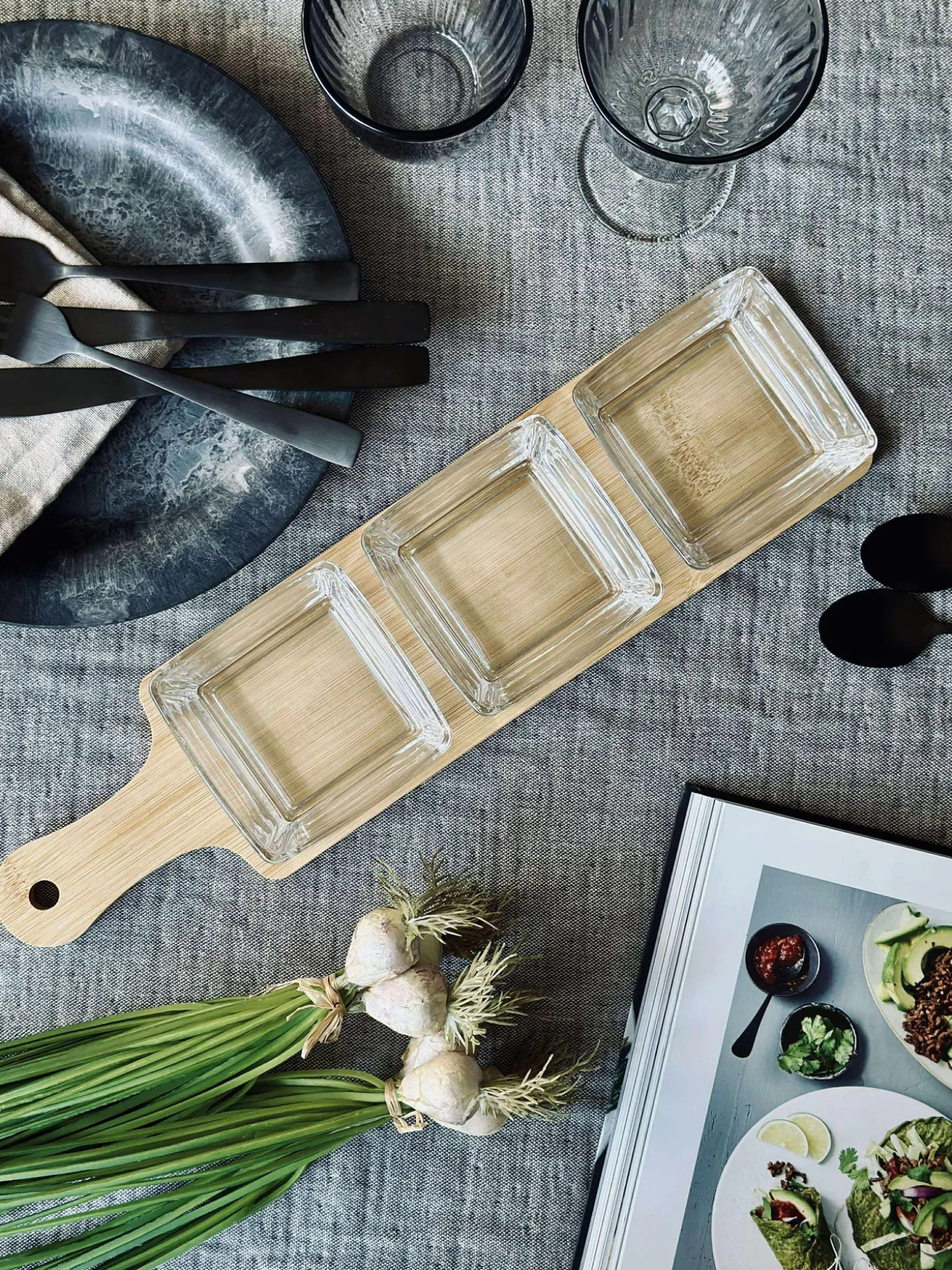 Skålene er i glas, og fadet er i bambus. Den naturlige farve og det enkle, ensfarvede look passer fint ind i et lyst og afslappet køkken- og bordunivers.