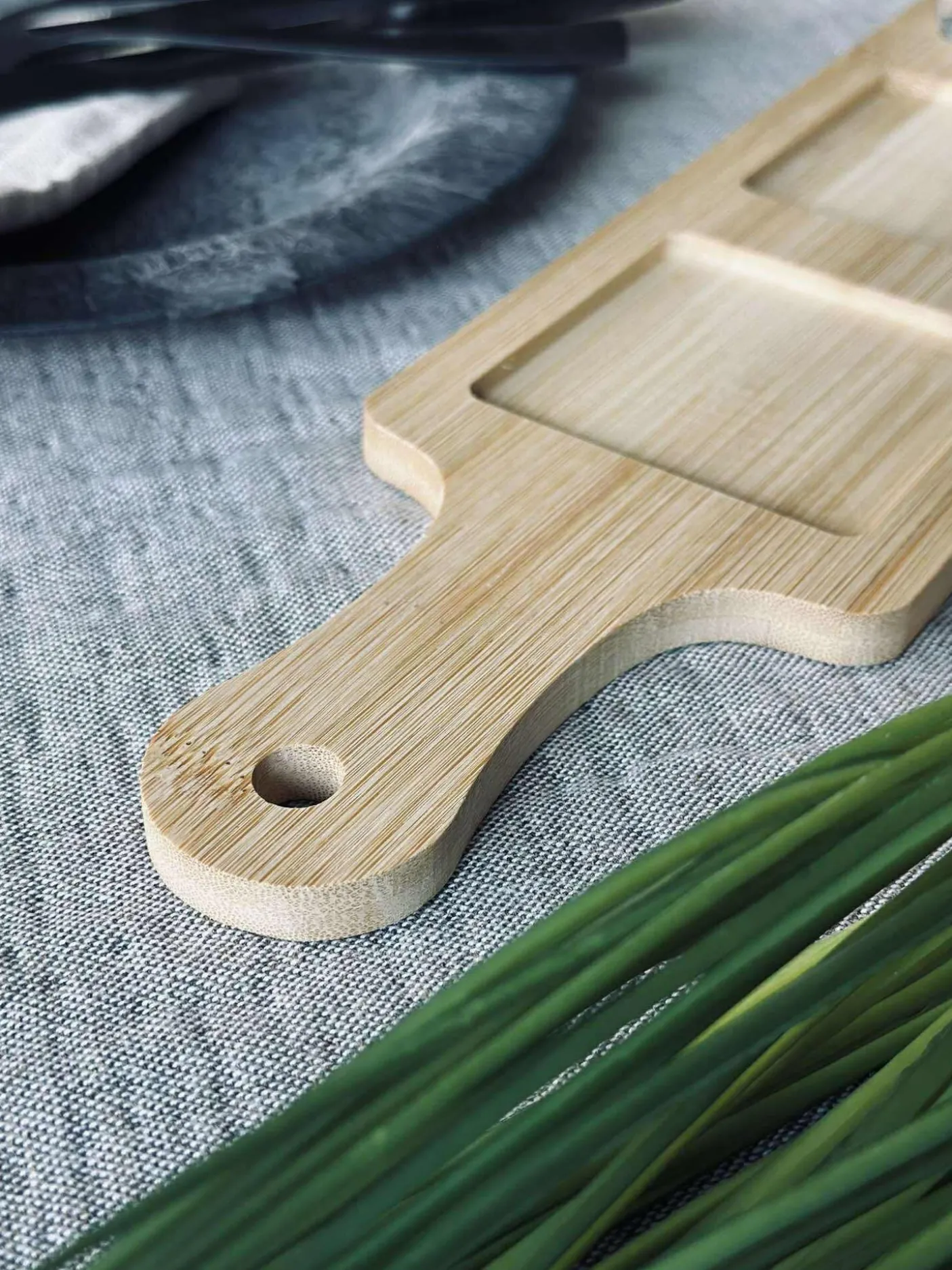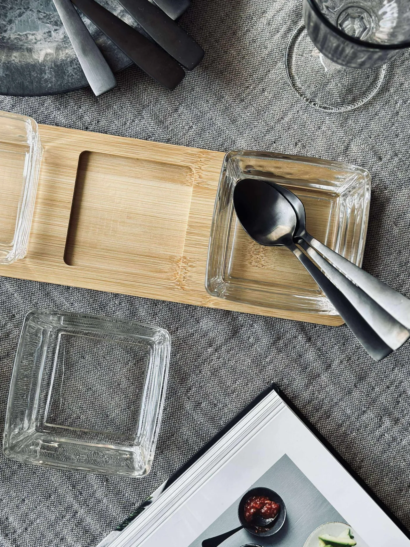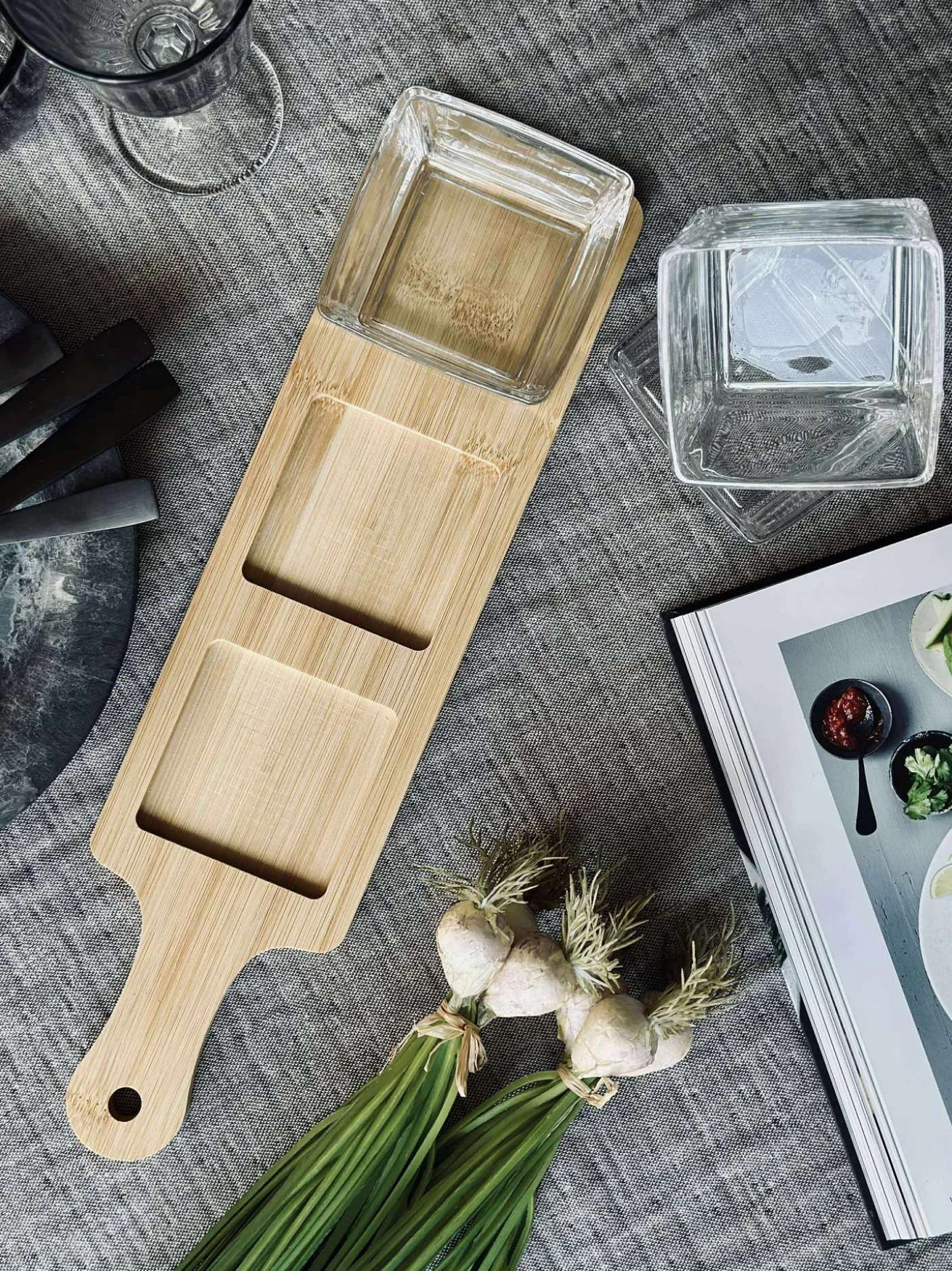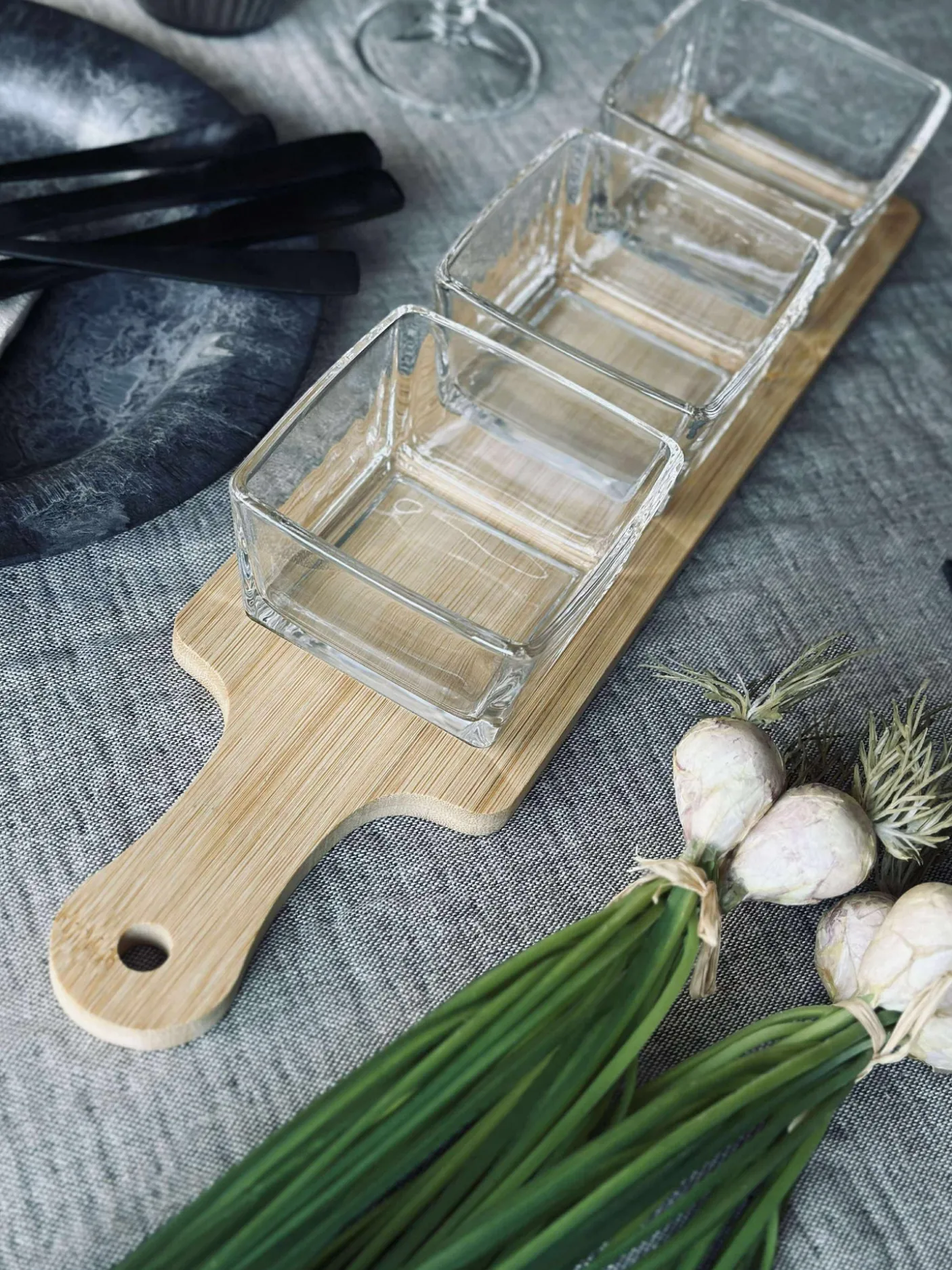 – et serveringssæt i 4 dele til små anretninger. Sættet består af tre skåle i glas og et serveringsfad i bambus i naturfarve med et roligt, ensfarvet udtryk.