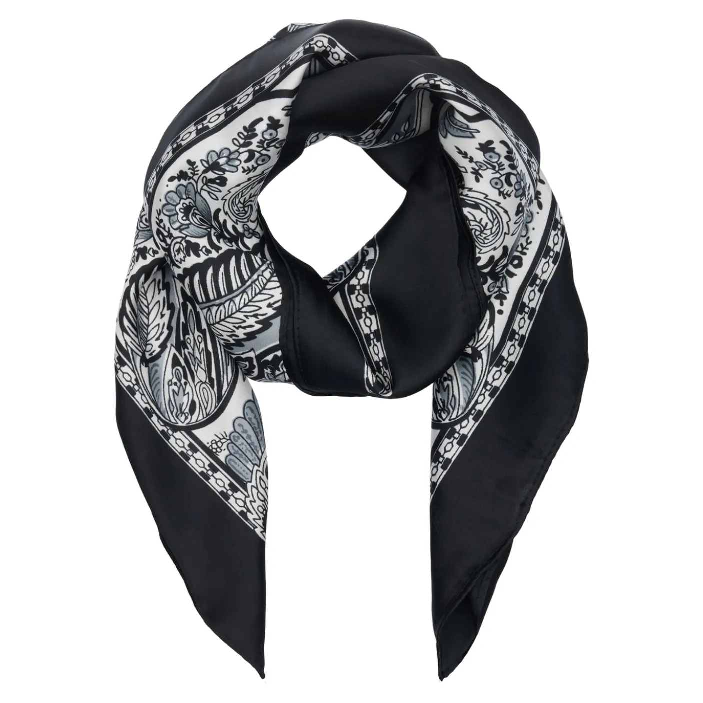 Polyester giver tørklædet et let og glat udtryk, mens printet tilfører karakter og et tydeligt grafisk præg. Den sorte farve holder looket roligt og stilrent.