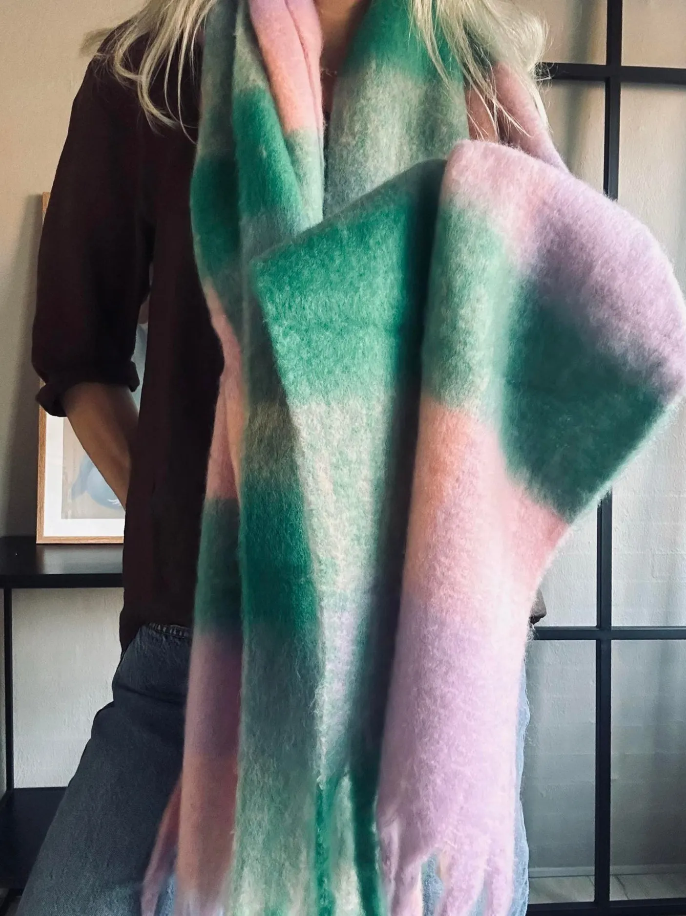 Tørklæde Ninna – Rosa / green er et vamset og blødt tørklæde med tydelige farvetoner i rosa og grøn. Det stribede mønster giver et roligt, dekorativt udtryk, som er nemt at sætte sammen med både neutrale og farverige looks.