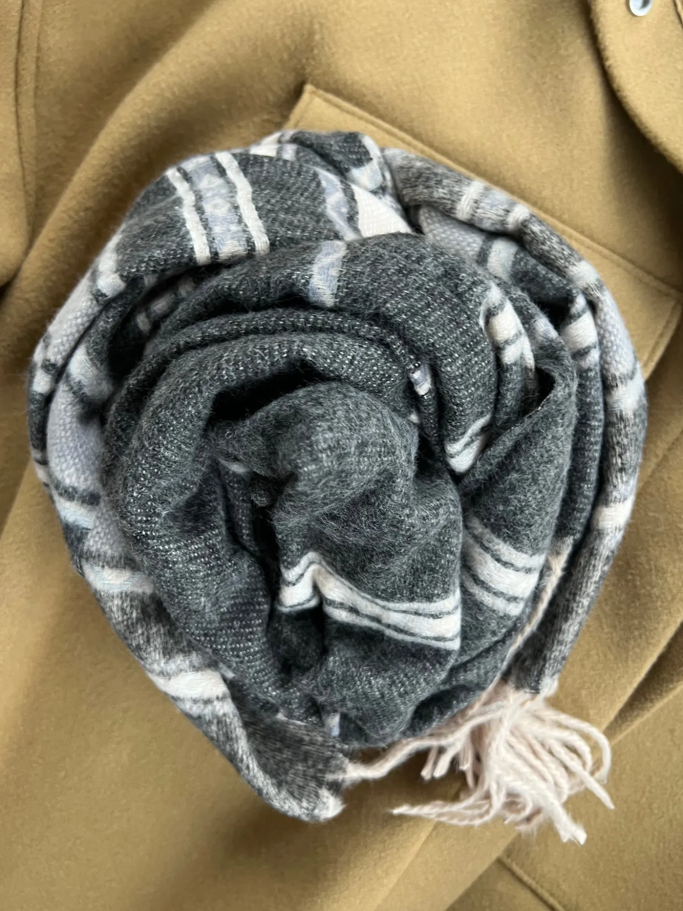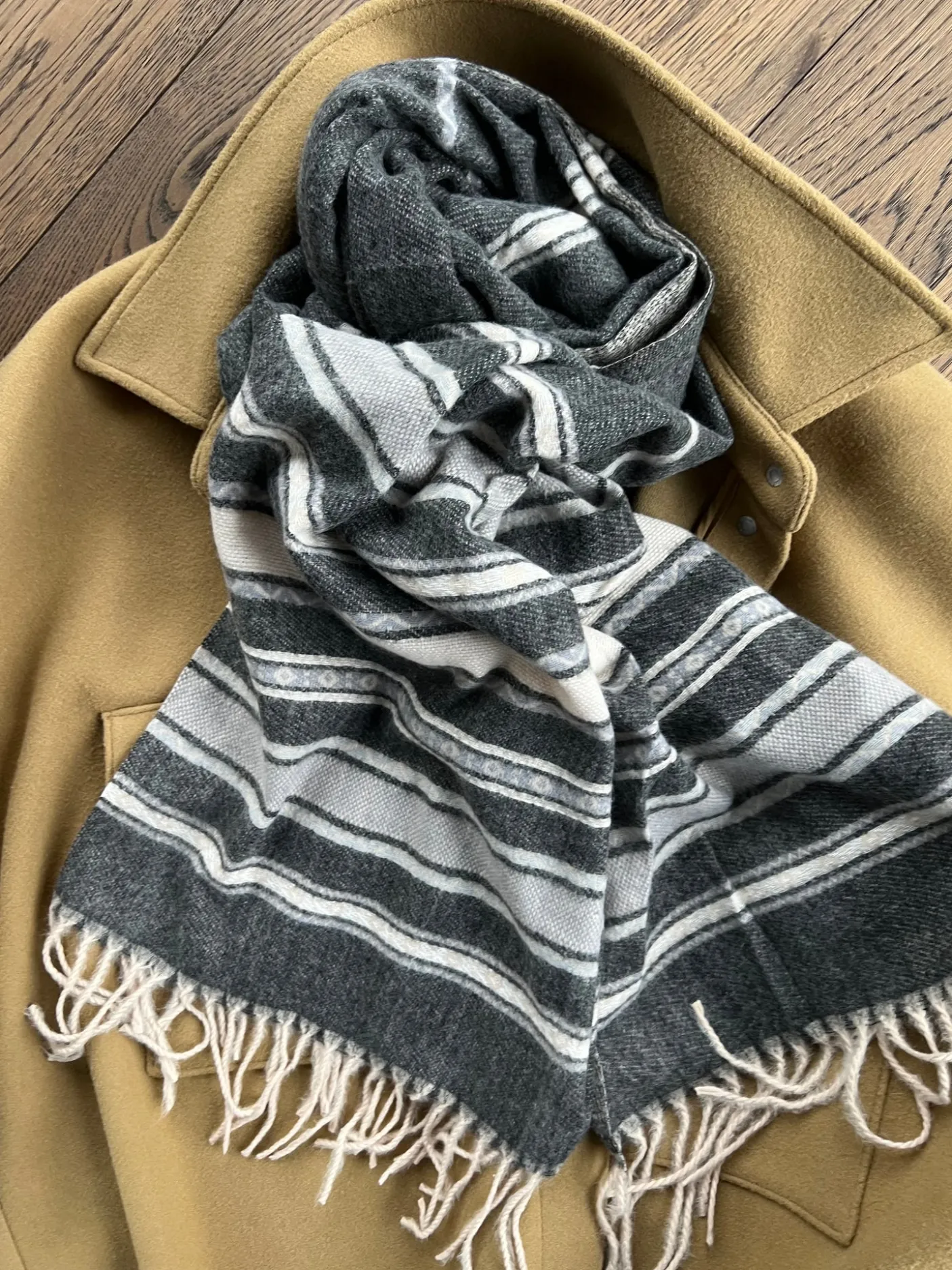 Den sorte farve og de enkle striber giver et roligt, klassisk udtryk. Materialeblandingen af viscose og uld bidrager til en blød fornemmelse.