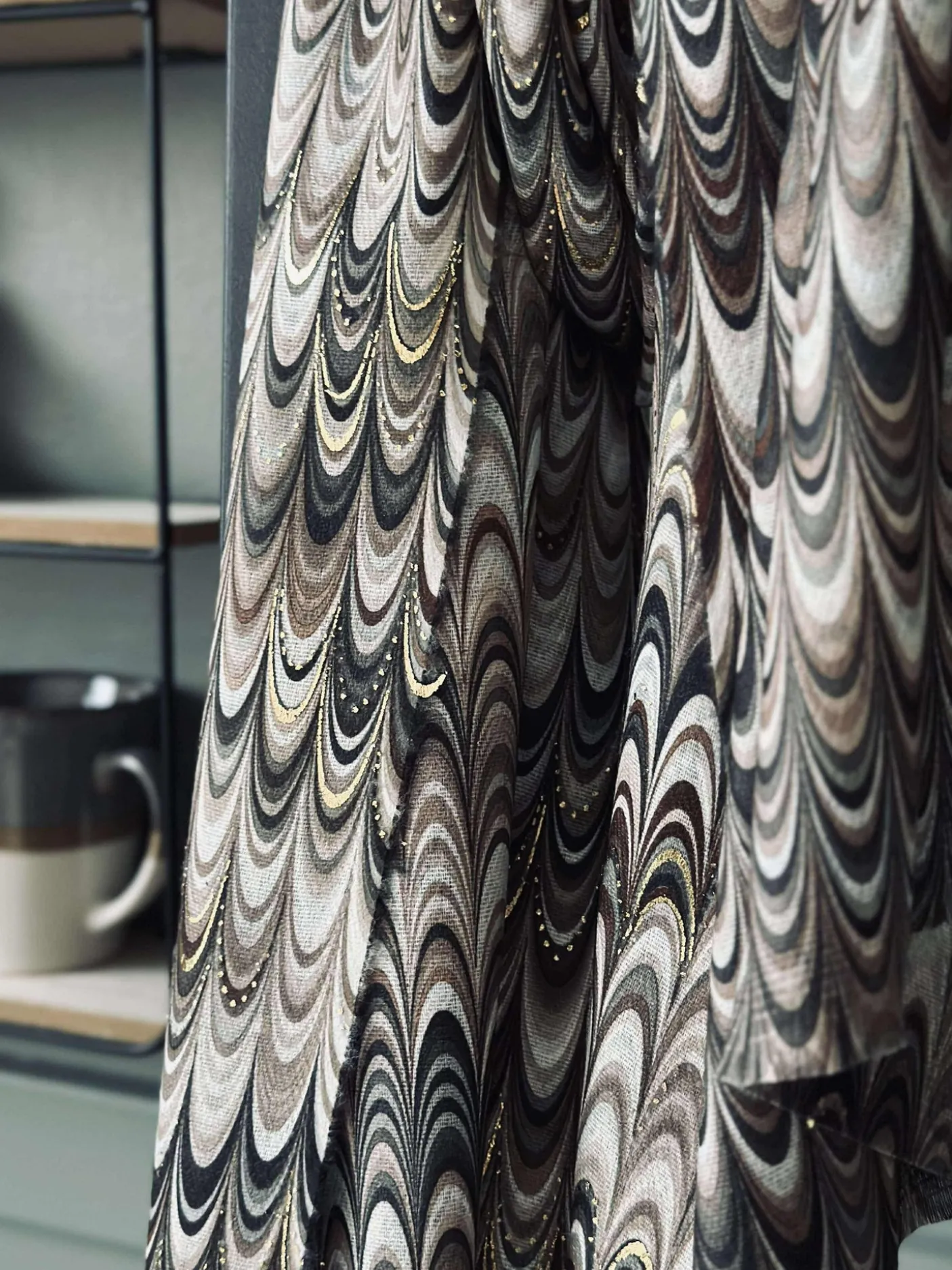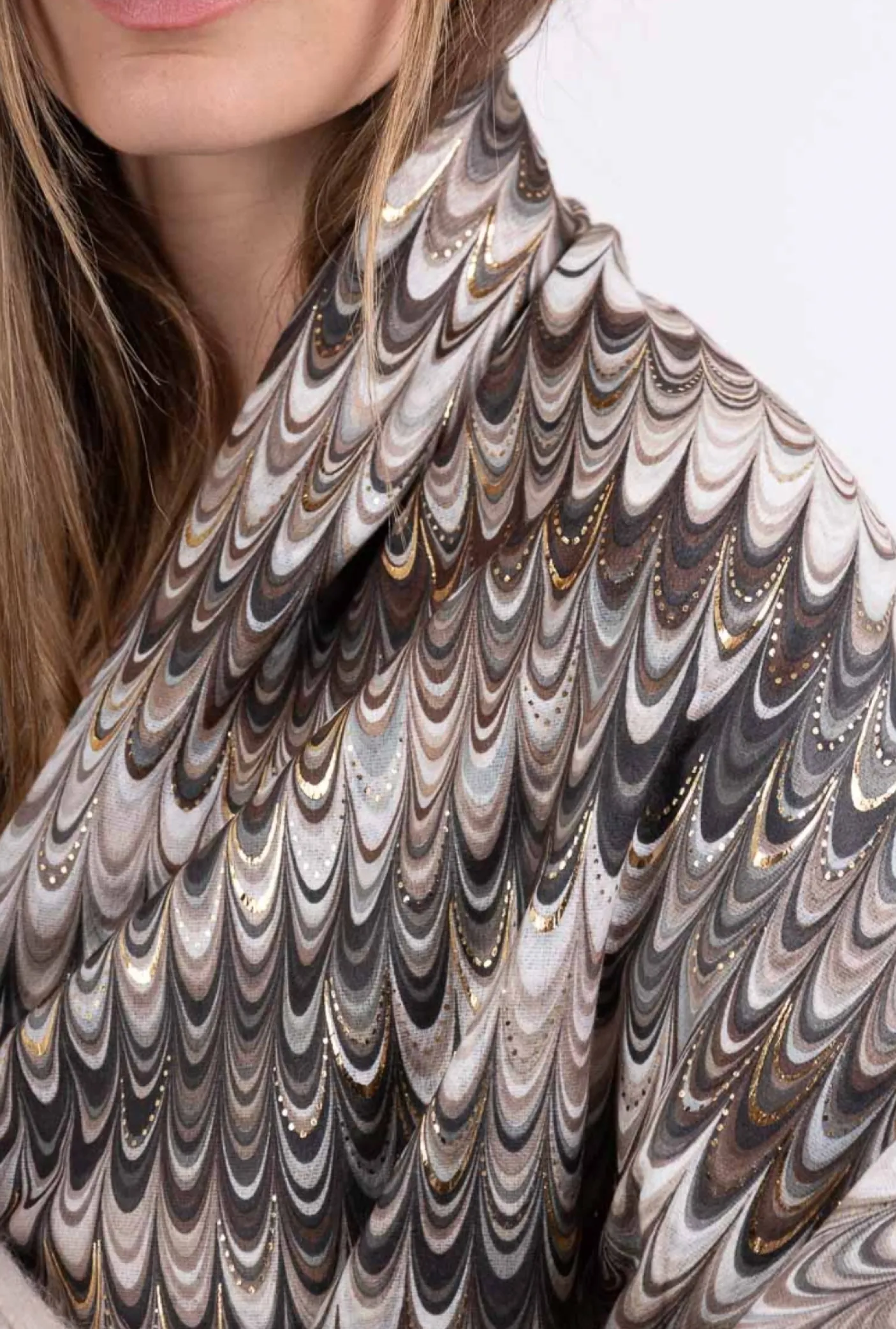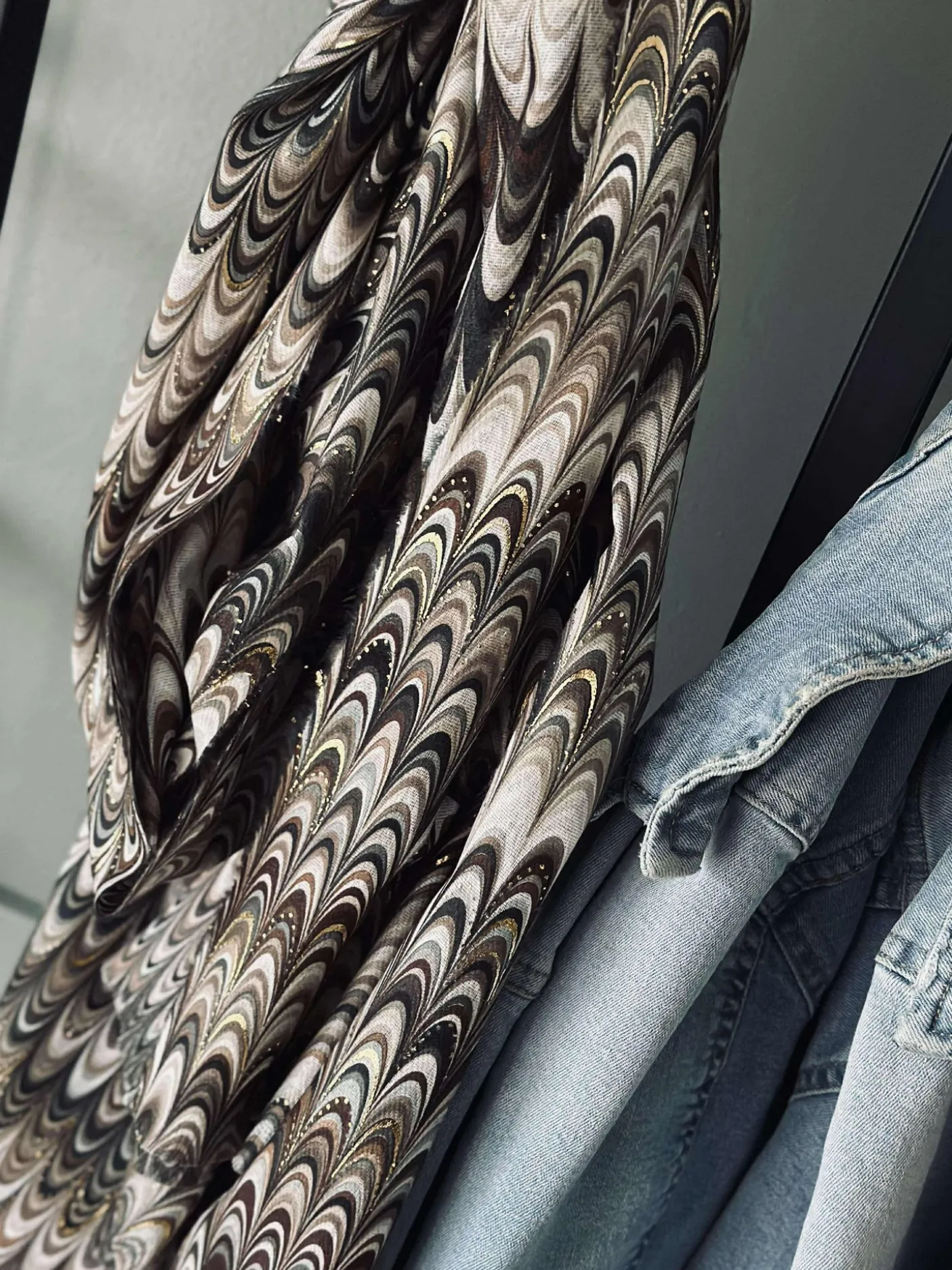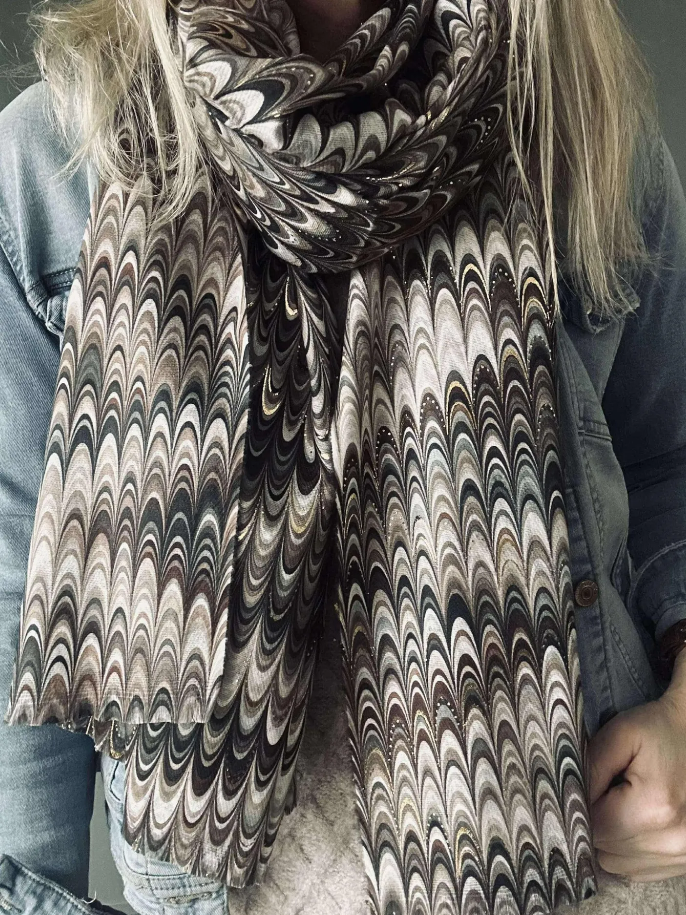 Tørklæde VIGA er et dekorativt tørklæde i brun med grafisk/geometrisk print og fine gulddetaljer, der giver et diskret skær. Det lette udtryk gør det nemt at style til både hverdag og mere festlige looks. Brug det som et klassisk tørklæde eller drapér det som et sjal for et blødere fald.