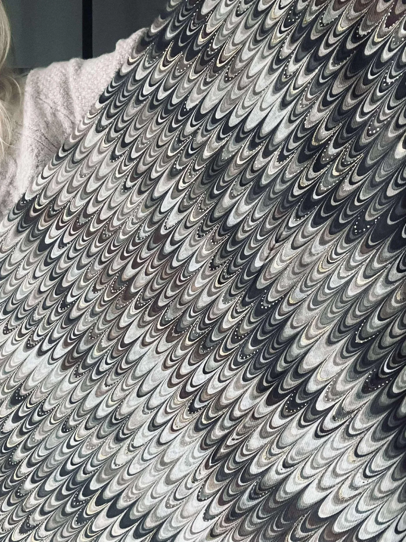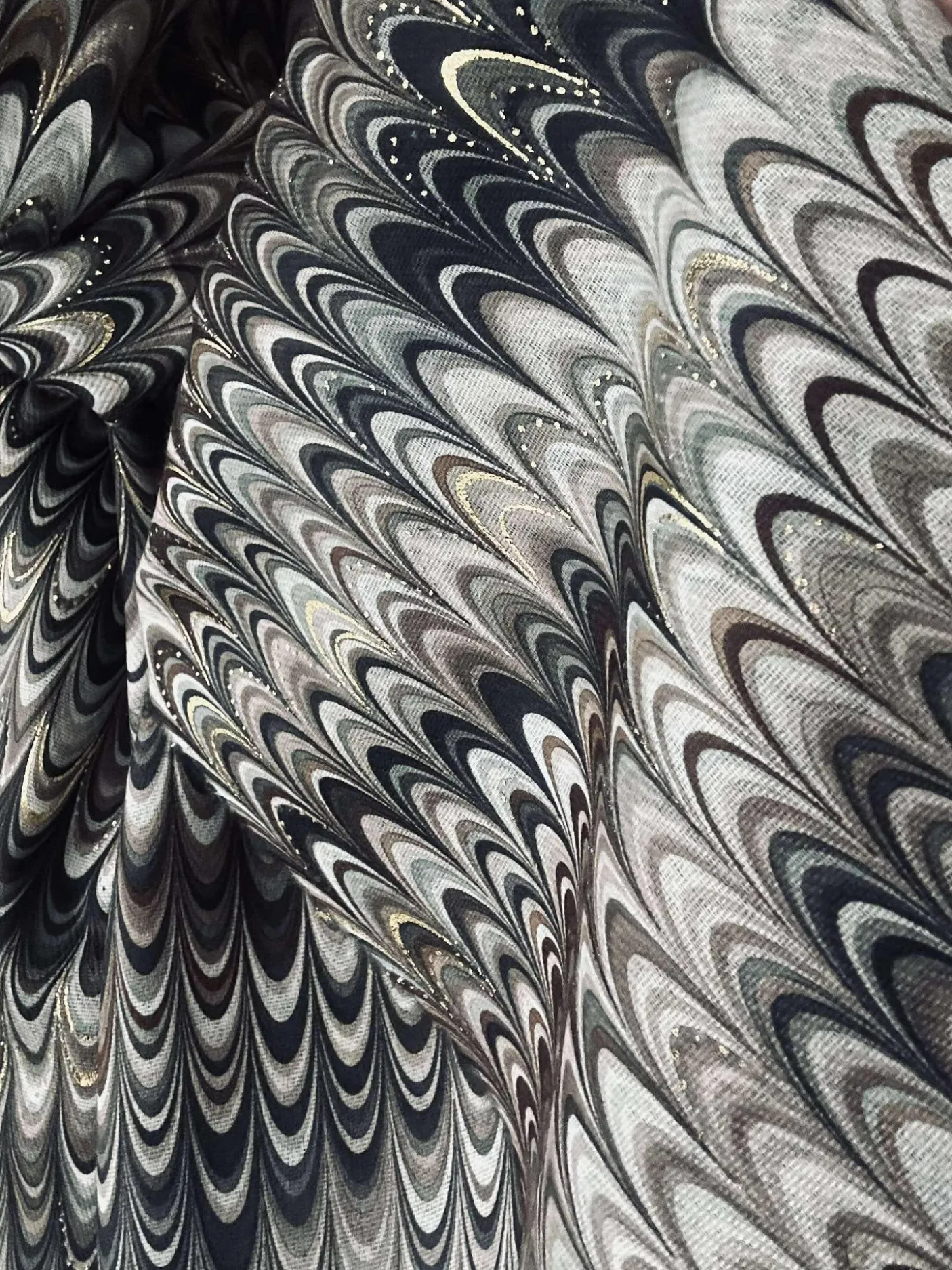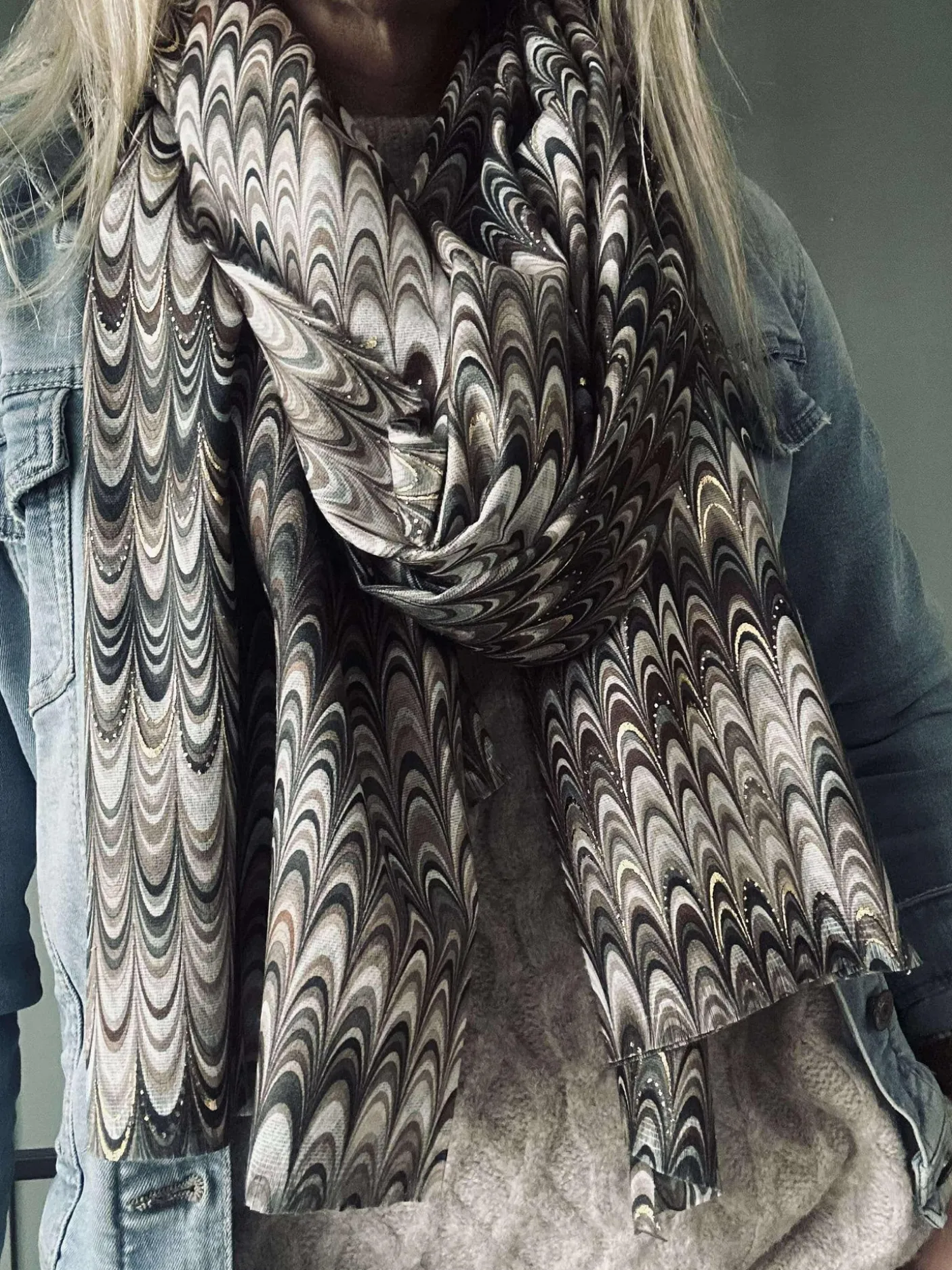 Tørklædet er lavet i viscose og har et grafisk/geometrisk mønster, der skaber et moderne, roligt udtryk. De gyldne detaljer tilføjer en elegant finish uden at dominere helheden.