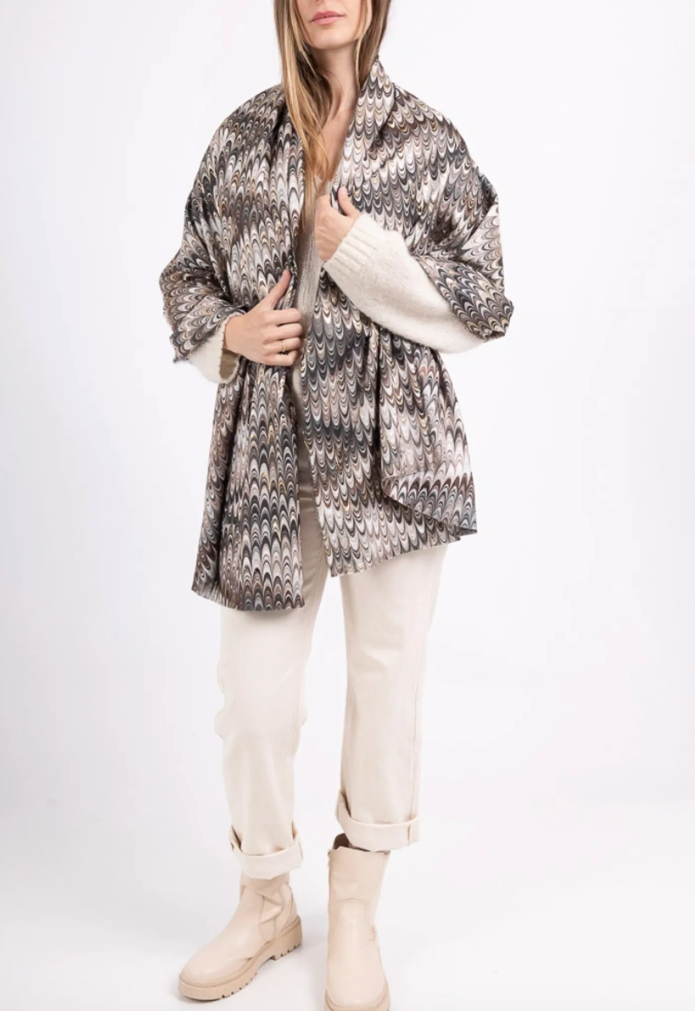 VIGA kan bruges over jakken som et ekstra lag eller som et let sjal, når du ønsker et mere afslappet look. Det fungerer også som en enkel måde at samle et outfit på med farve og mønster.