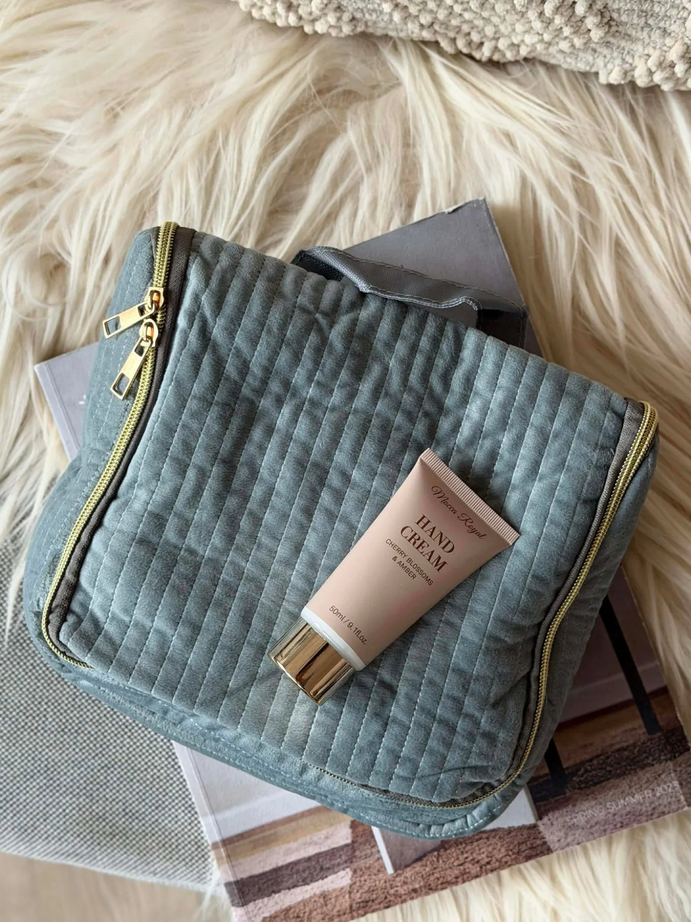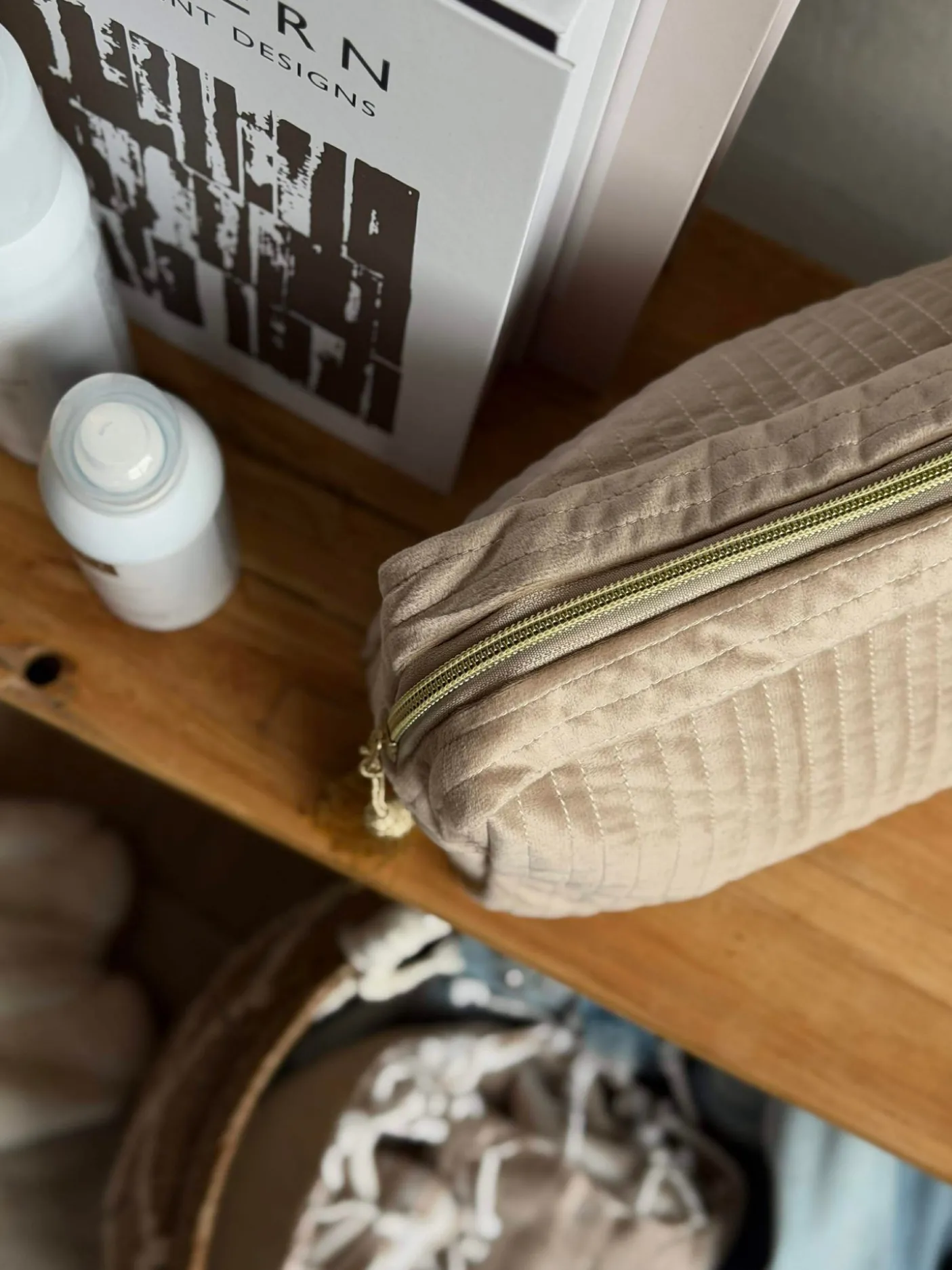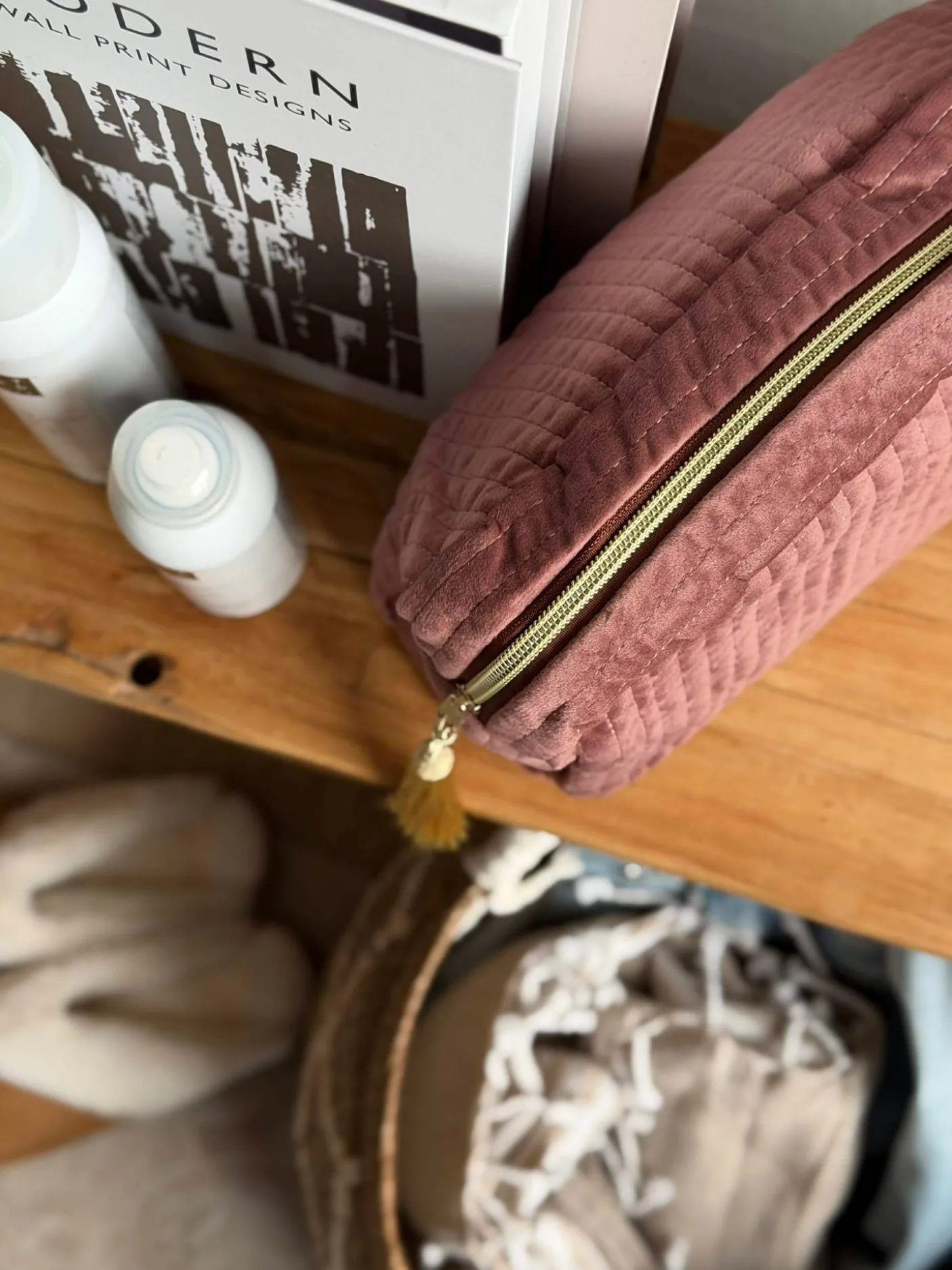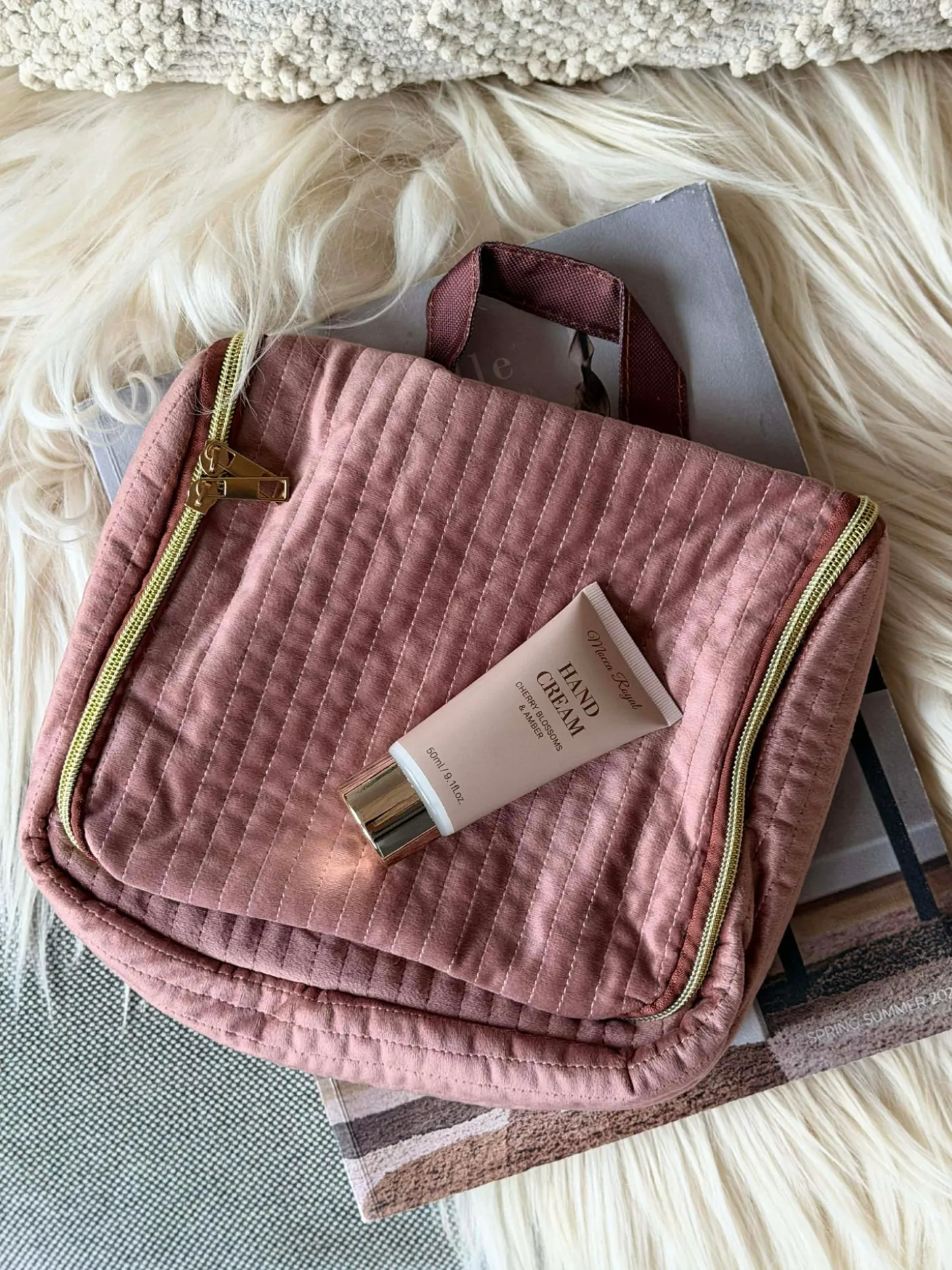 Toilettaske Gia er en blød toilettaske til opbevaring af toiletartikler på rejse eller i hjemmet. Udført i babyfløjl med målene L 26cm x H 20cm x D 7cm. Tilkøb evt. rejsetasken der matcher.