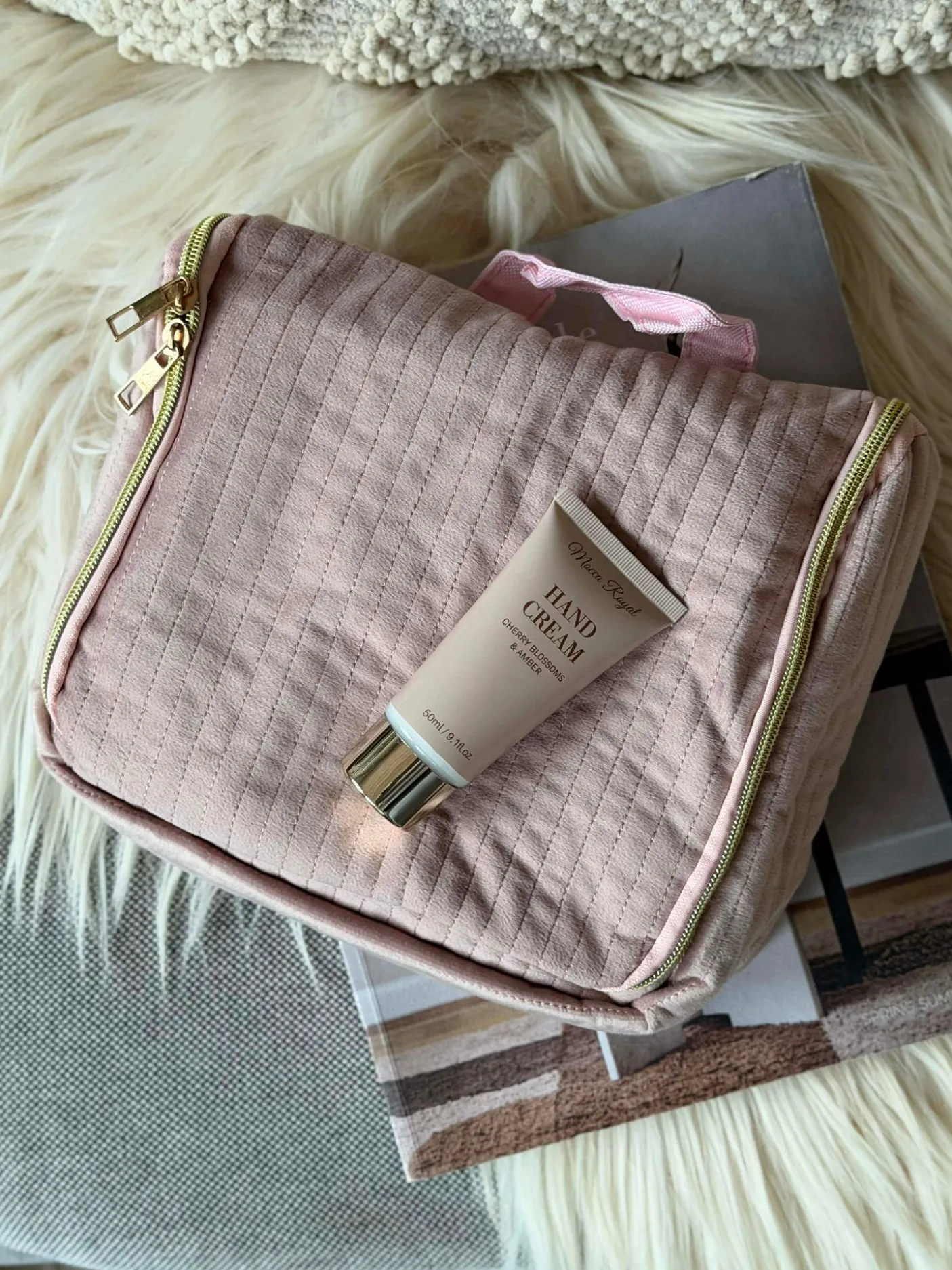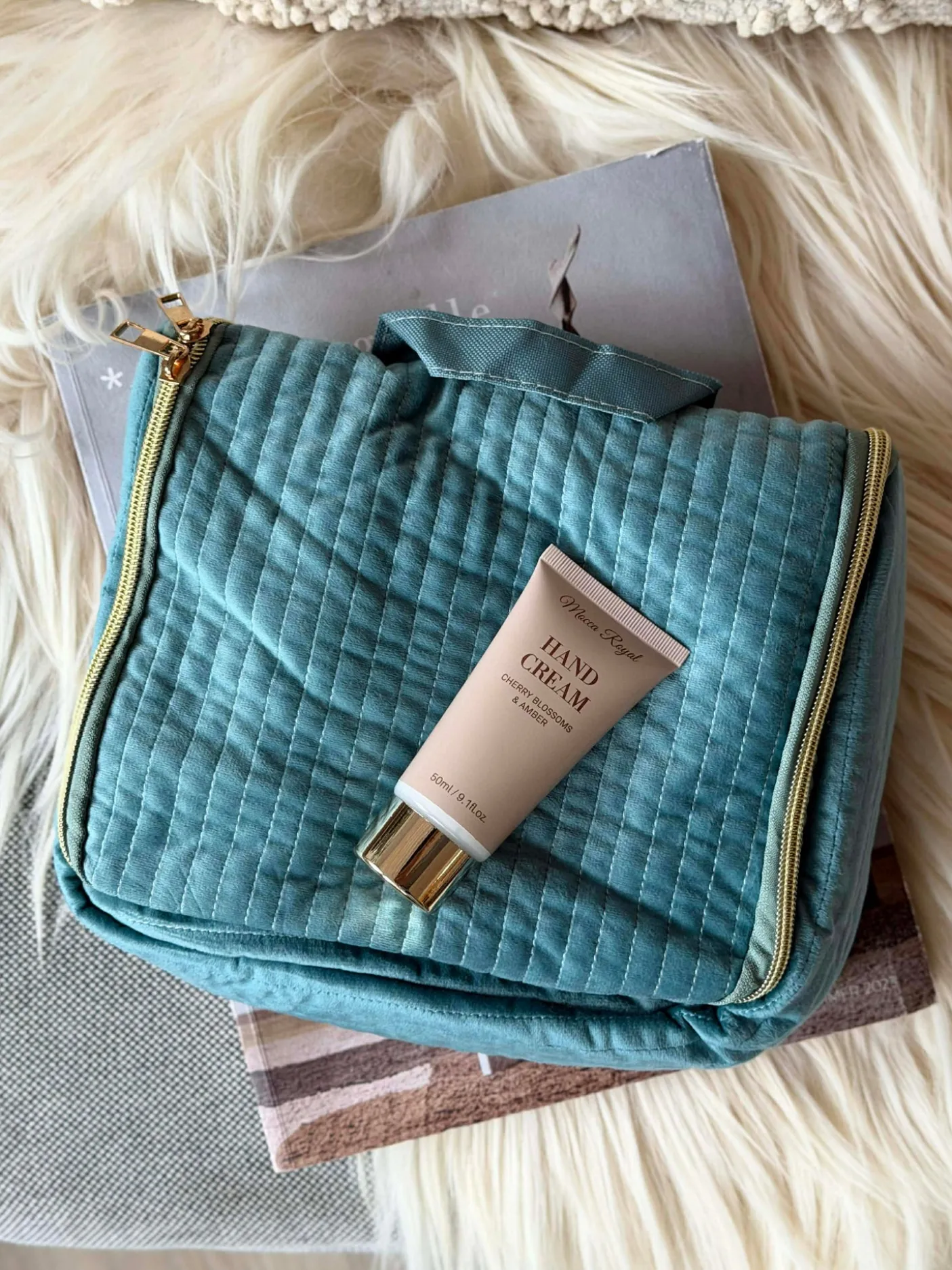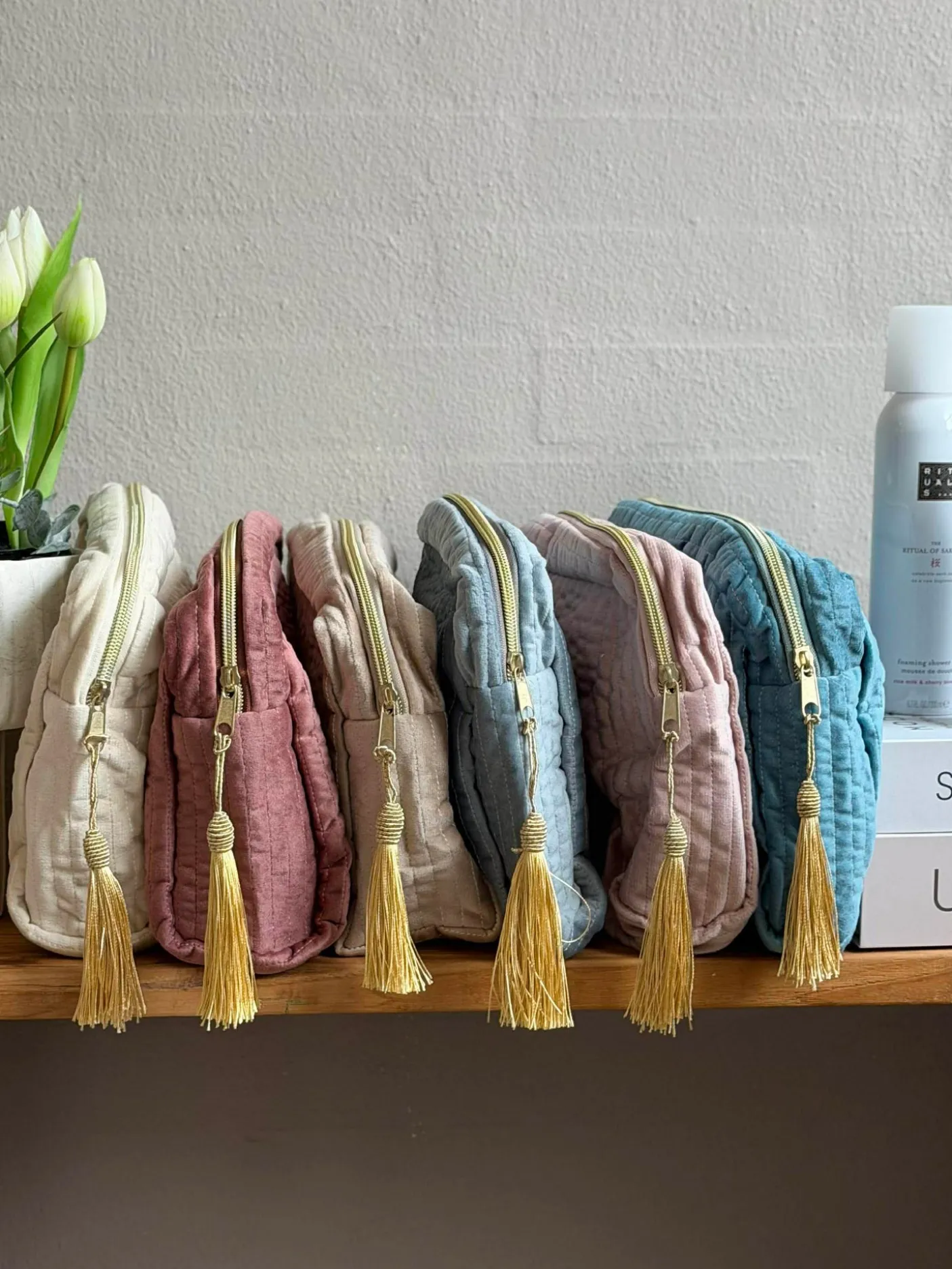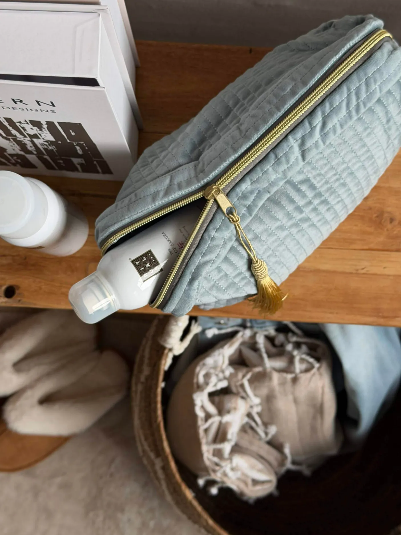 Toilettaske Gia er en blød toilettaske til opbevaring af toiletartikler på rejse eller i hjemmet. Udført i babyfløjl med målene L 26cm x H 20cm x D 7cm. Tilkøb evt. rejsetasken der matcher.