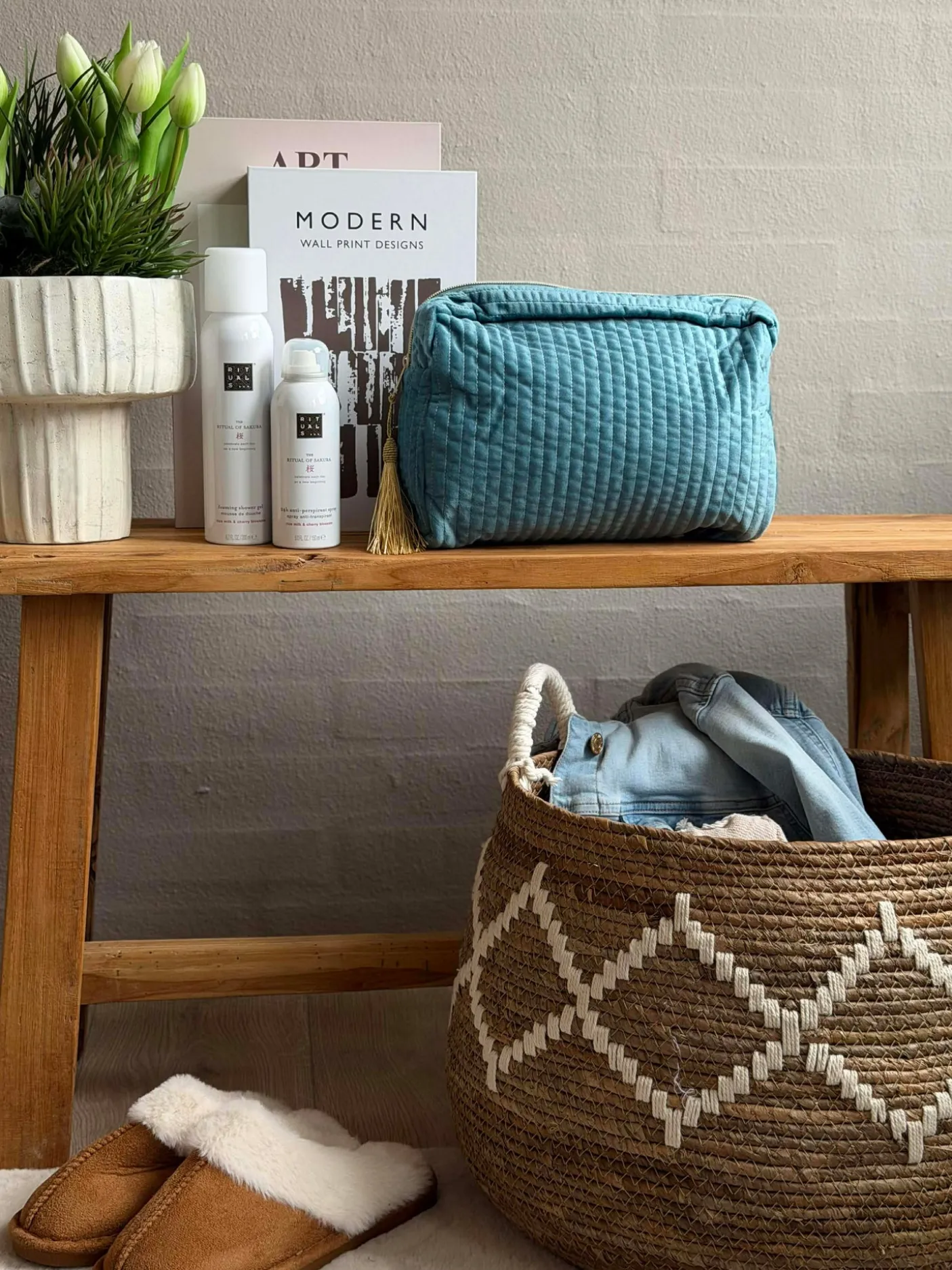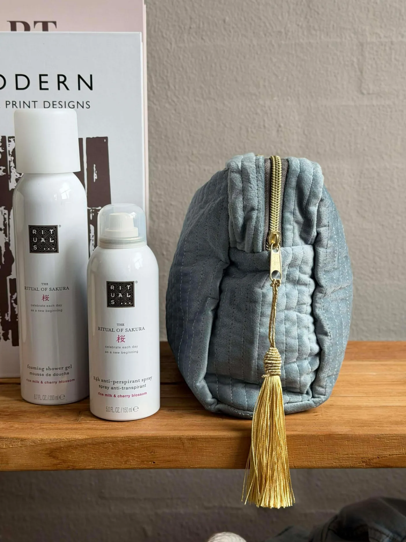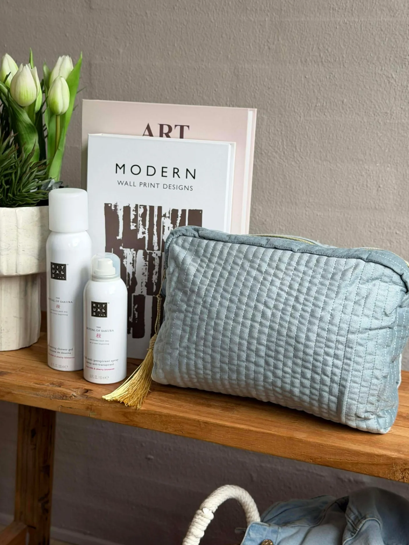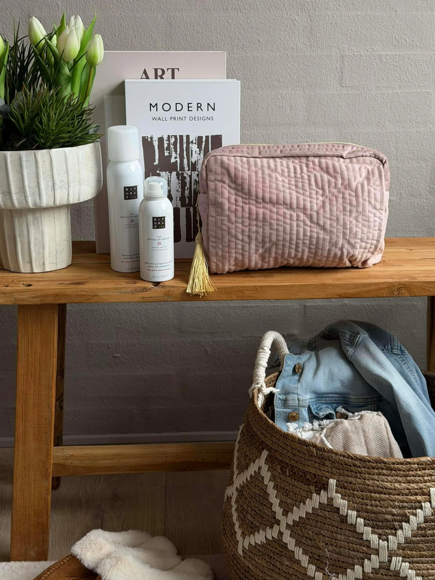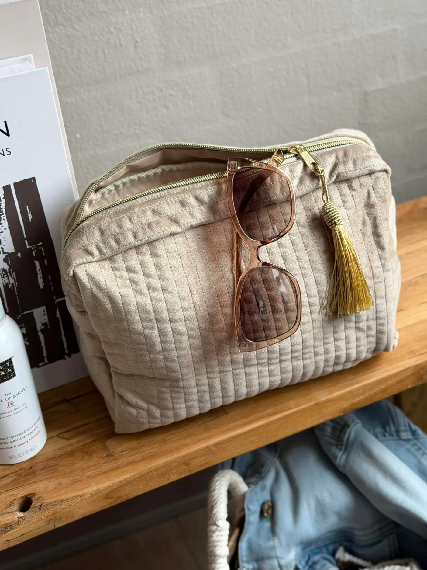 Toilettaske Gia er en blød toilettaske til opbevaring af toiletartikler på rejse eller i hjemmet. Udført i babyfløjl med målene L 26cm x H 20cm x D 7cm. Tilkøb evt. rejsetasken der matcher.