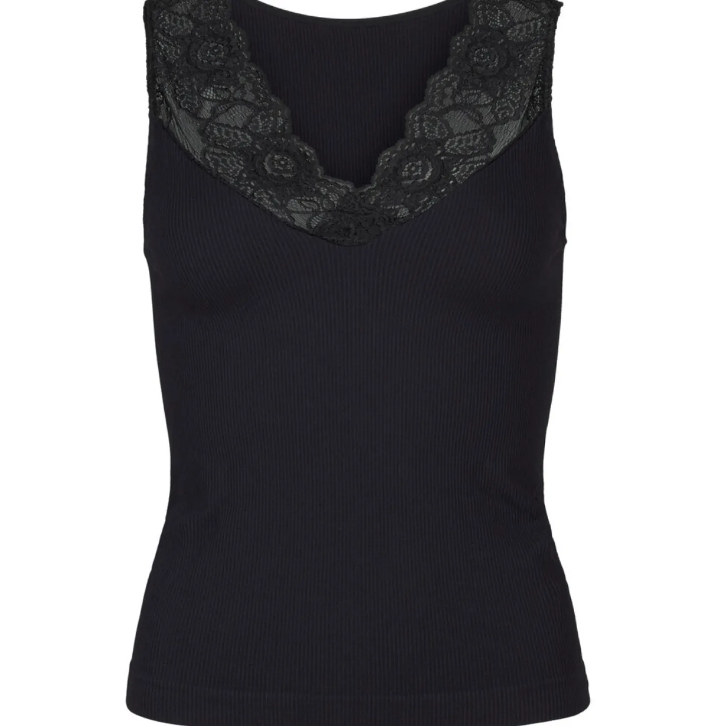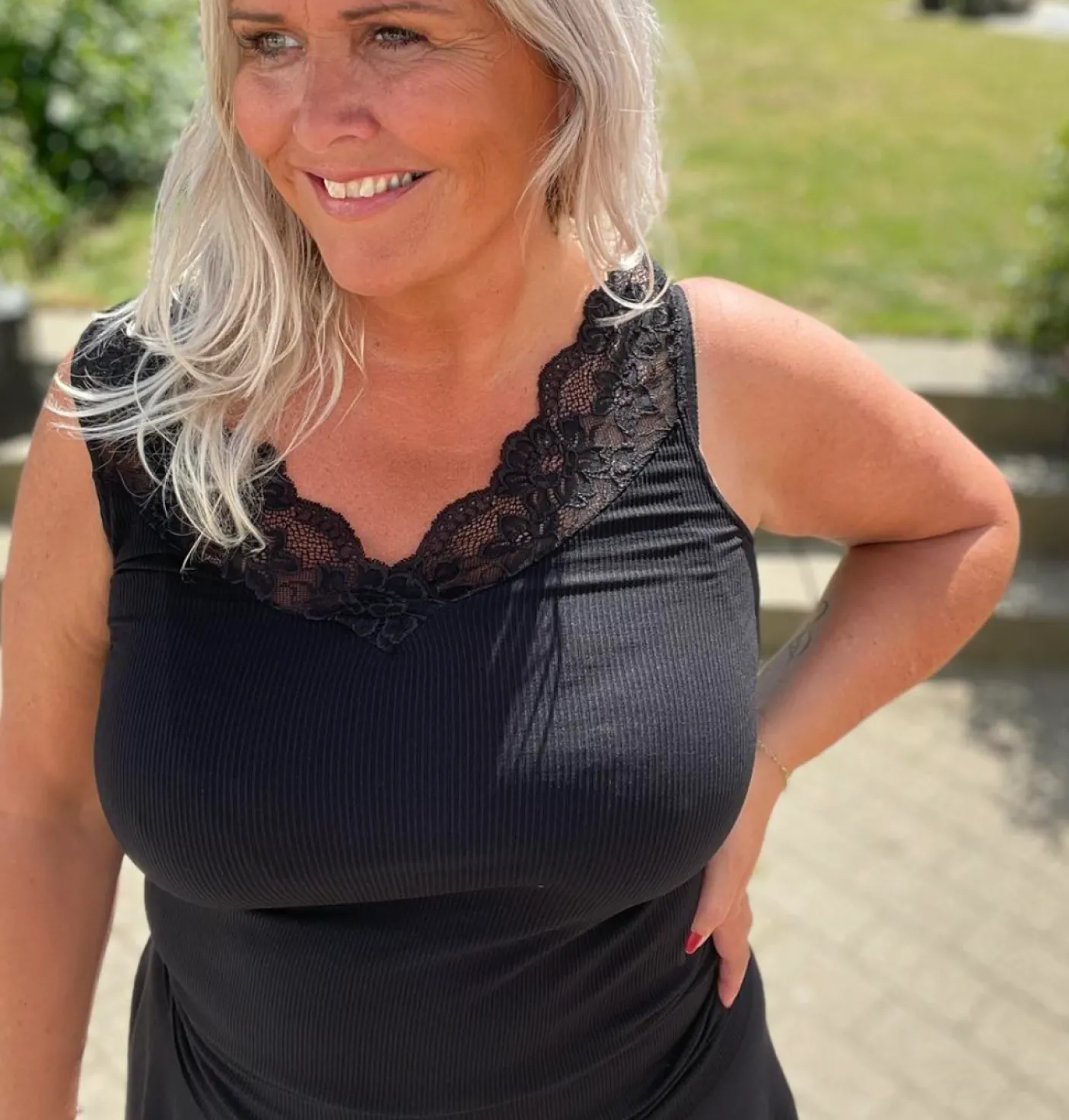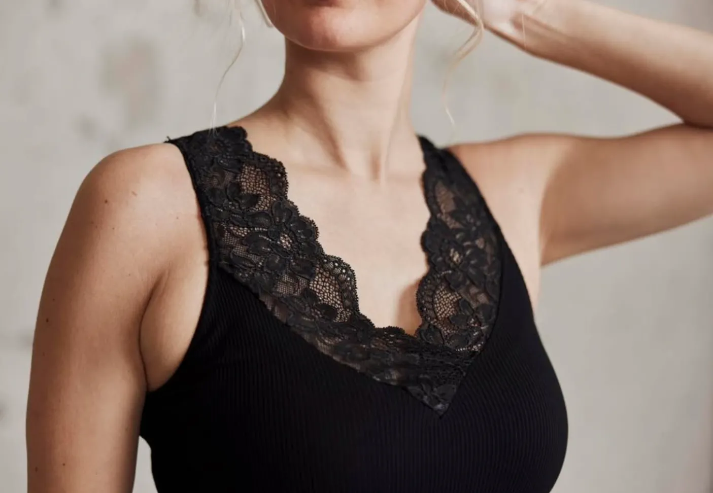 Rib top med blonde ned i V. Toppen kan vendes, så V-udskæringen er på ryggen.