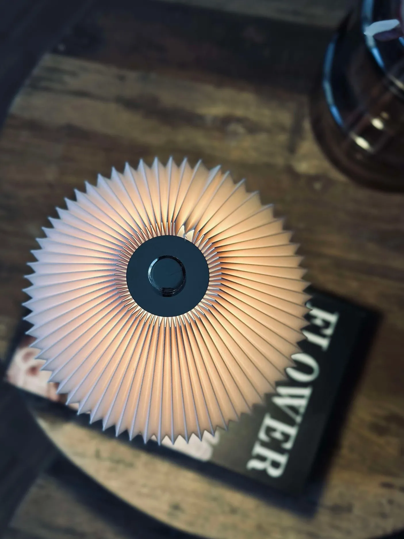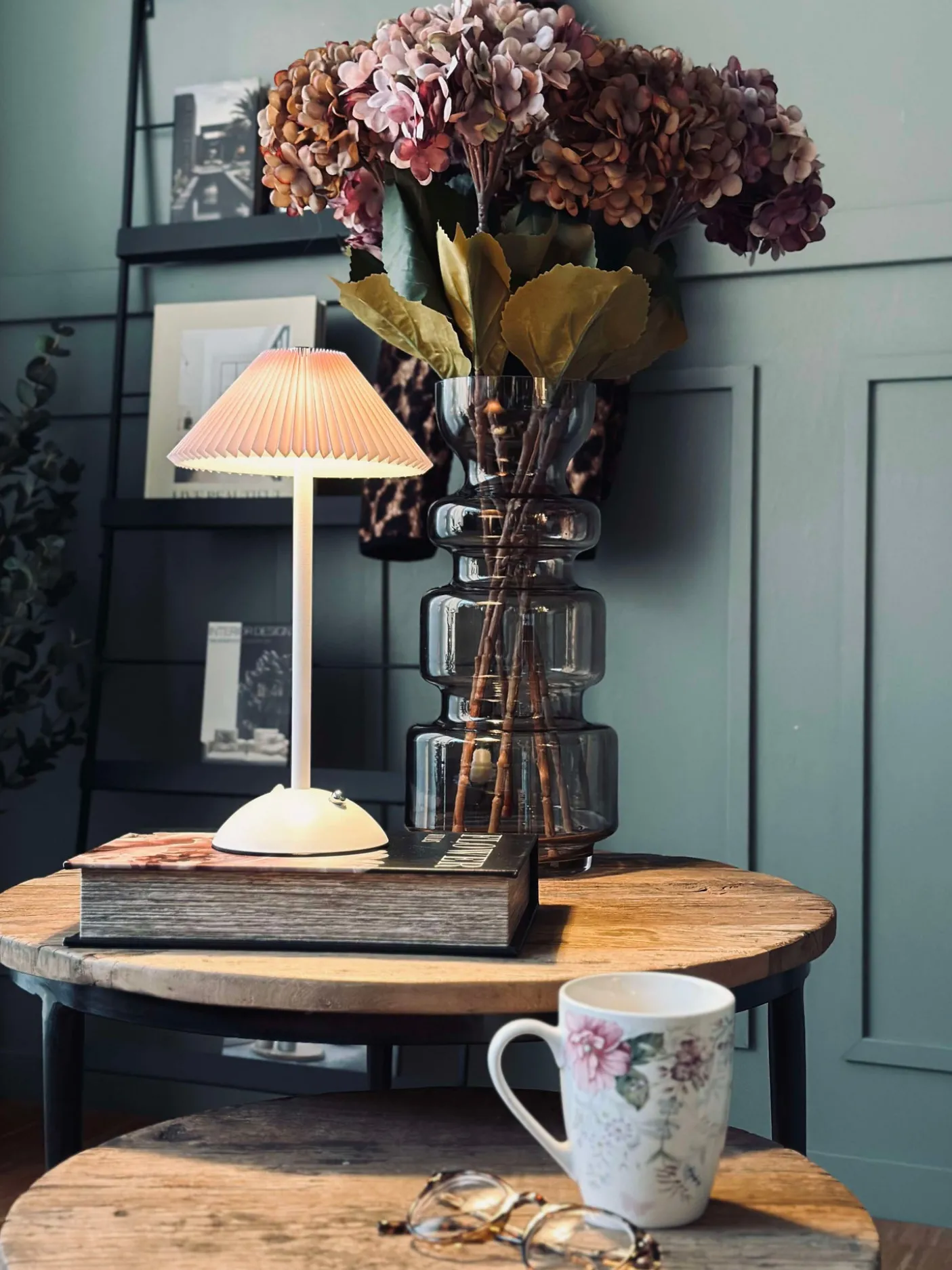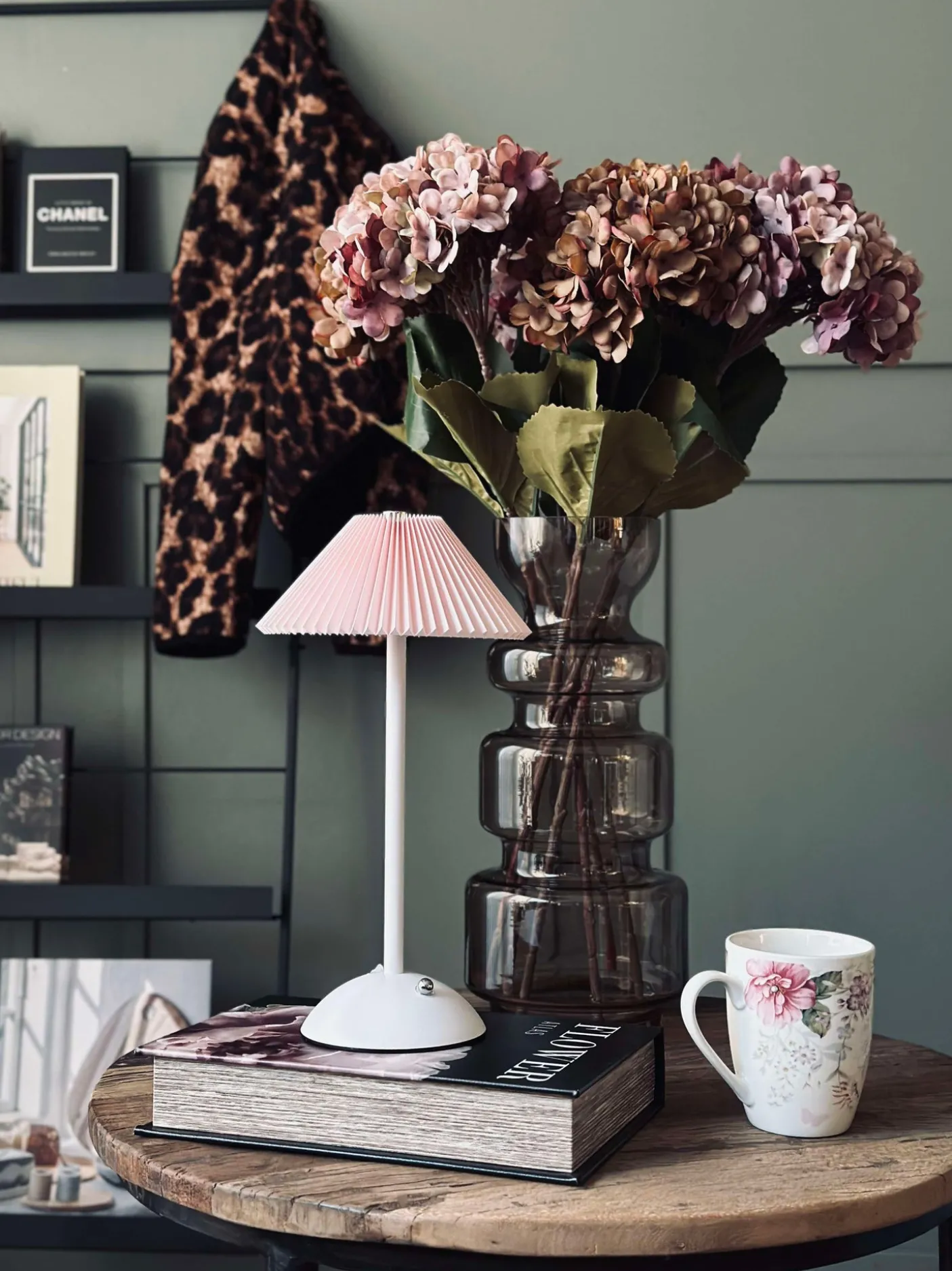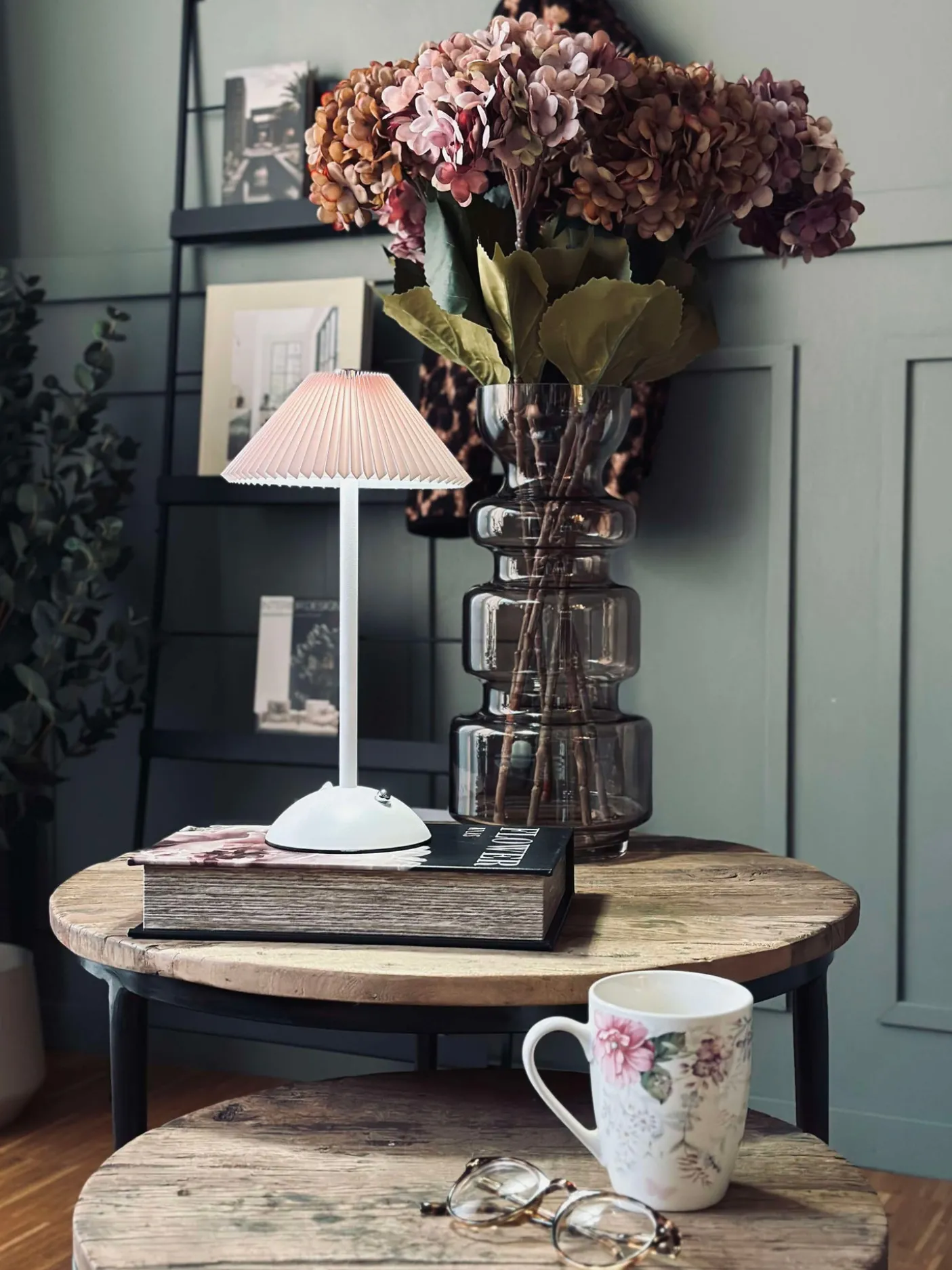 Bordlampe med touch funktion og lampeskærm i plissé.