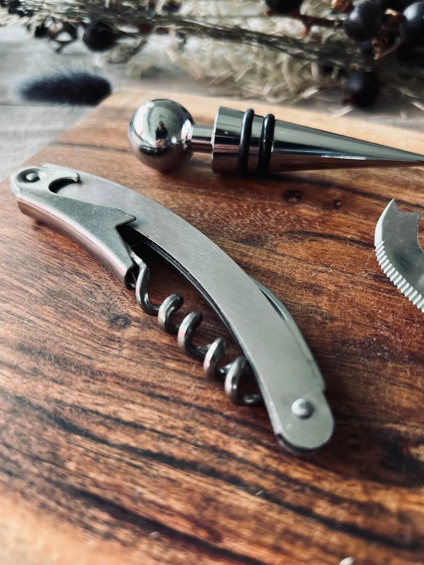 Sættet består af både vin oplukker, prop og to dele til ost, så du har de vigtigste redskaber samlet, når der skal åbnes og serveres.