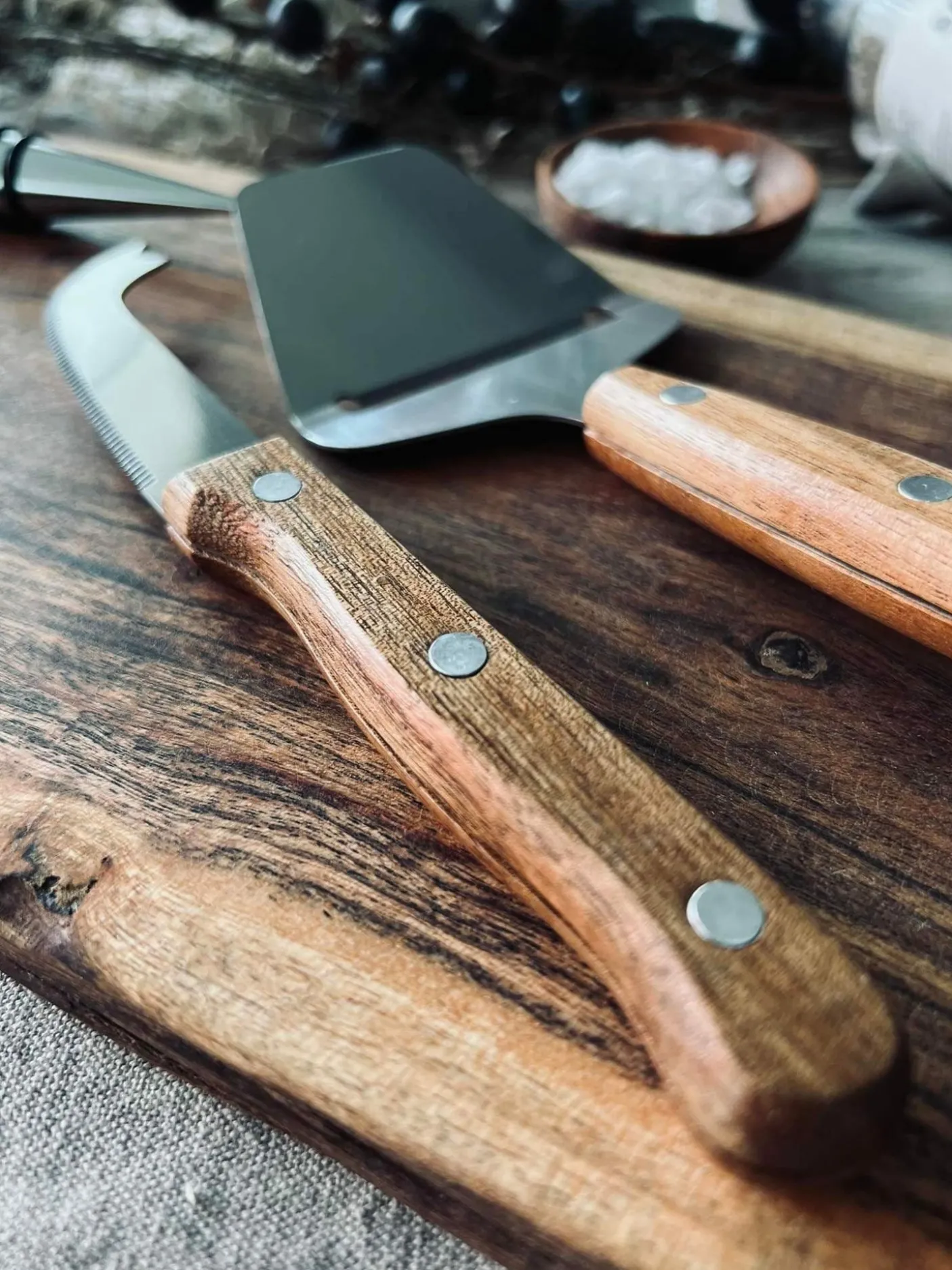 Vin og oste sæt – oplukker og knive er et samlet sæt til servering af vin og ost. Det ensfarvede, sølvfarvede udtryk giver et roligt og klassisk look på bordet, uanset om du dækker op til tapas eller en enkel osteservering.