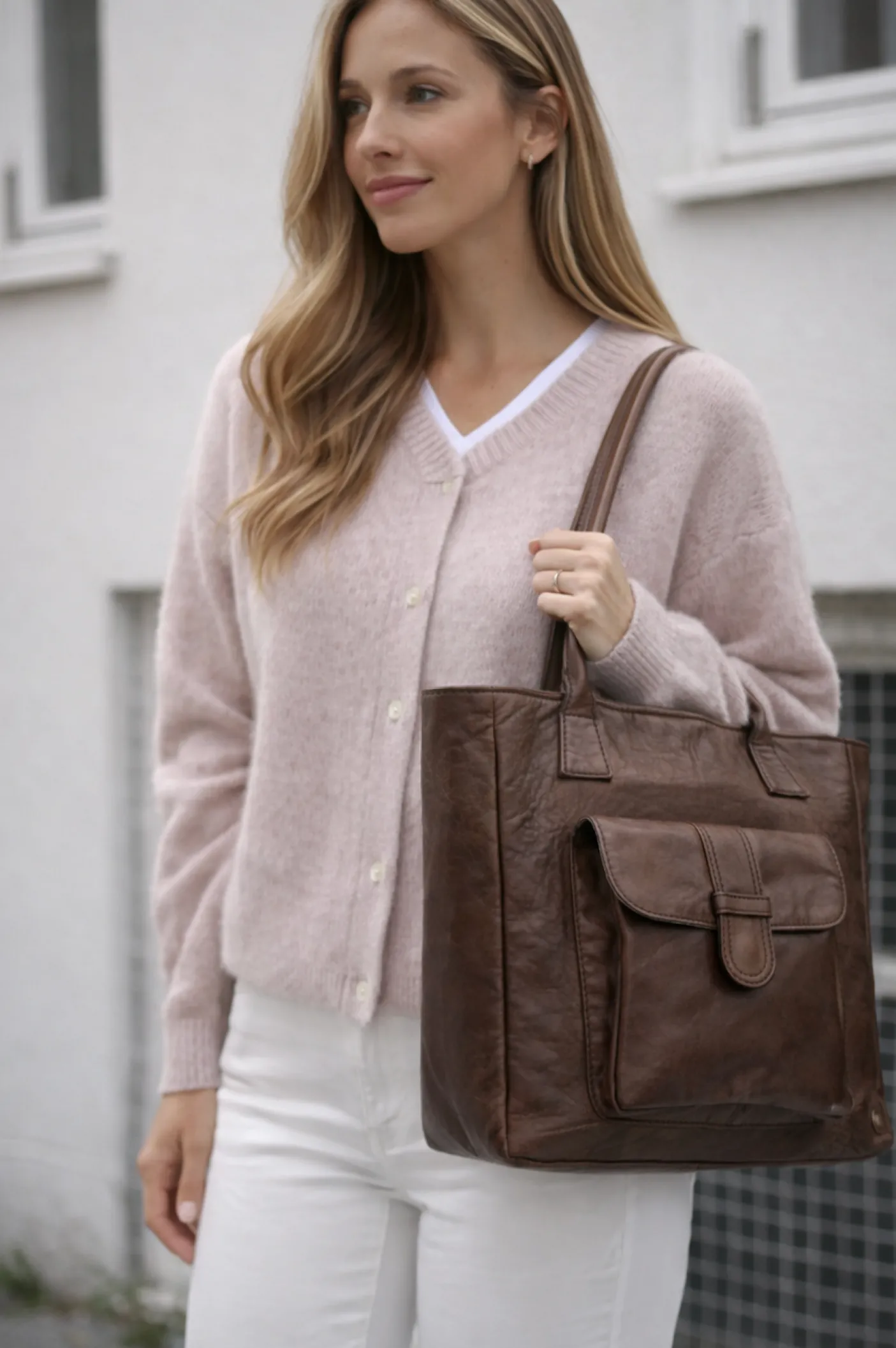 Materiale: 100% lammeskind med en smidig overflade og et eksklusivt look. Lammeskindets blødhed giver en behagelig fornemmelse i hånden, og taskens klassiske linjer står i kontrast til det markante skindspænde på frontlommen. Samspillet mellem enkel form og detaljer skaber et tidløst, men moderne udtryk.